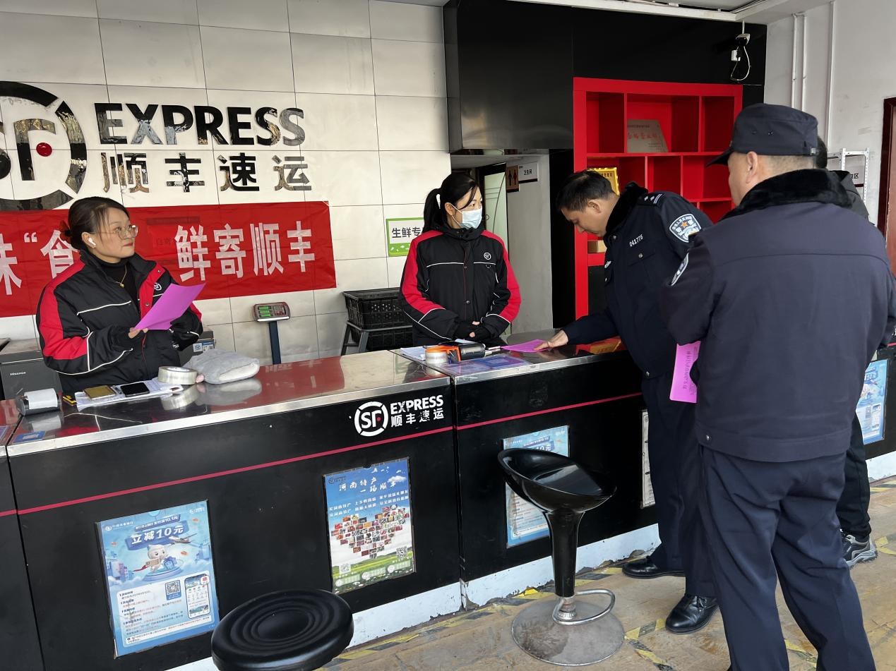 在寄递公司营业大厅内,执法人员在向寄递公司员工发放宣传彩页,详细解释寄递野生动植物及其制品的有关法律法规及违法责任,提醒遇到非法寄递野生动植物情况的要及时拨打110报警。