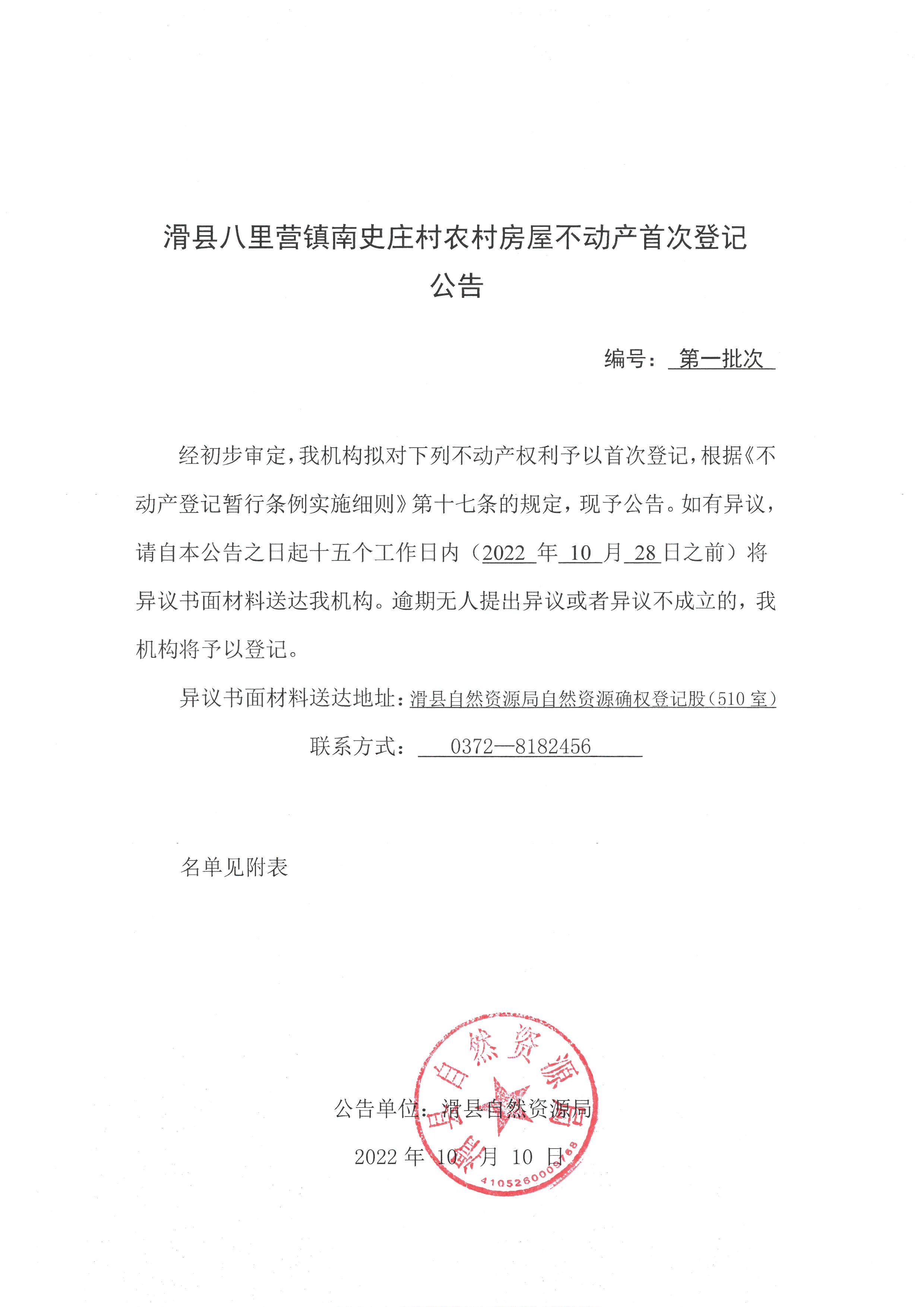 滑县八里营镇南史庄村农村房屋不动产首次登记公告