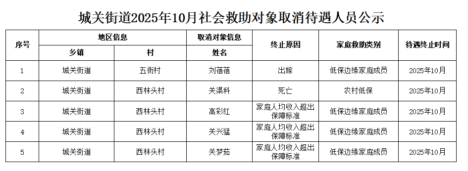 城关街道2025年10月社会救助对象取消待遇人员公示