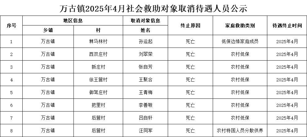万古镇2025年4月社会救助对象取消待遇人员公示