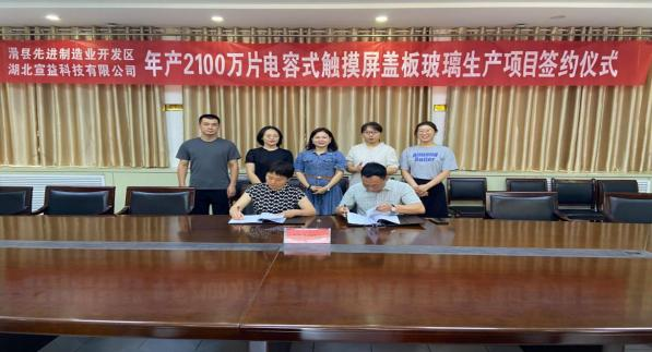 7月26日上午,滑县先进制造业开发区与湖北宣益科技有限公司关于建设年产 2100 万片电容式触摸屏盖板玻璃生产项目签约仪式成功举行。开发区管委会副主任孔聪利代表开发区与湖北宣益科技有限公司总经理徐俊峰进行了签约。开发区投资促进局局长王琳琳以及相关负责人参加签约仪式。