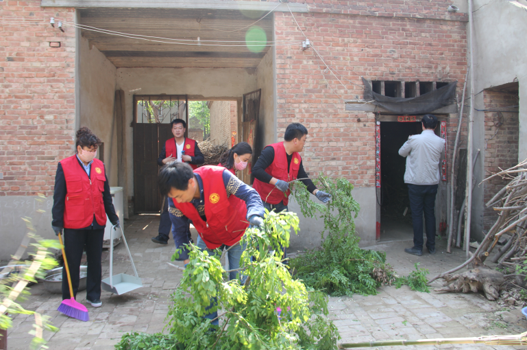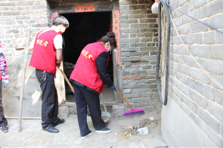 志愿者们带着工具首先来到白月行家,白月行本人残疾,无法从事体力劳动,妻子患有精神疾病,大儿子在外打工,小儿子在上小学,家中还有82岁的老母亲,其家中凌乱不堪,院内杂物成堆。大家说干就干,有的拿起扫帚扫地,有的清理长荒了的树枝,还有的拿起抹布擦拭积了厚厚污渍的门窗,一个个干得热火朝天。打扫干净白月行家,来不及休息的志愿者们又赶到贫困户常少位家,继续忙碌起来......