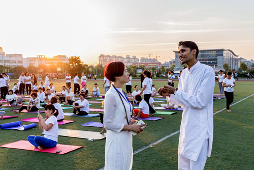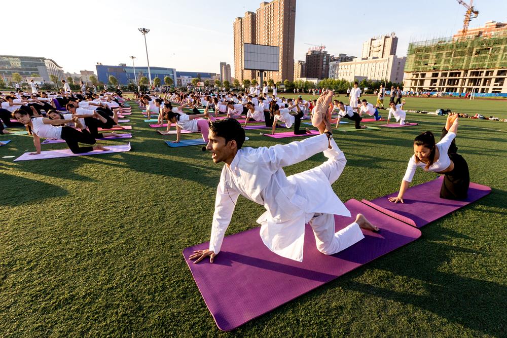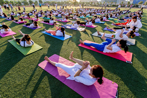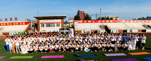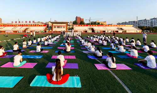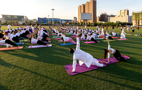 6月17日早晨,滑县新区体育场,远阳瑜伽馆的100余名瑜伽爱好者跟着印度籍的世界瑜伽协会高级瑜伽教练Sid(Shitanshu Sharma)练习瑜伽,倡导全民健身,喜迎第二届“国际瑜伽日”的到来。据了解,国际瑜伽日,为每年的6月21日。国际瑜伽日于2014年12月11日由联合国第69/131号决议宣布设立。国际瑜伽日旨在提高全世界对于练习瑜伽可以带来诸多益处的意识。