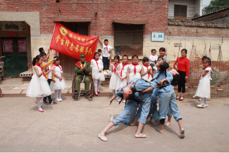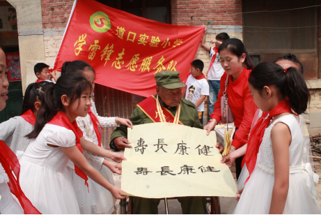 该校红领巾学雷锋志愿服务队,到小铺乡杨公店村老红军袁守智家中,送上水果、食品,为老红军表演诗朗诵、舞蹈、情景剧、唱歌等节目,现场书写毛笔字“健康长寿”送给老爷爷。