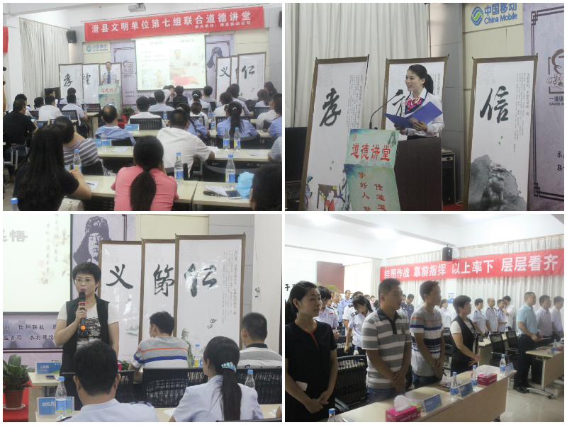 倡道兴德做好事 荐善举义做好人。7月19日下午,由滑县移动公司主办的滑县文明单位第七组联合道德讲堂在分公司五楼会议室成功开讲。本期道德讲堂由滑县分公司主办,地税局、二实验中学、民政局、国税局、信用联社、质监局、水务局、便民中心、城管局、食品药品监管局、水利建设专业队11个单位协办,共60余人走进“道德讲堂”,感悟道德力量。