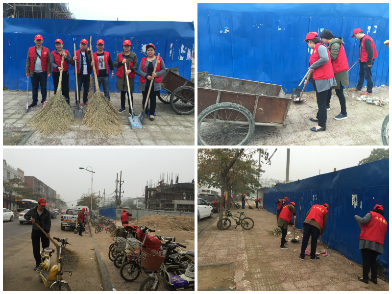 活动中,志愿者们拿着扫帚、簸箕、钳子、垃圾袋等清洁工具清扫道路落叶和垃圾,墙壁处乱贴的小广告,灌木丛中的塑料袋、花坛中的杂草、纸屑。不放过任何卫生死角,对临街路面、居民生活垃圾堆放点、沿街绿化带进行了全面认真地清理打扫, 劝阻过路群众的不文明行为。