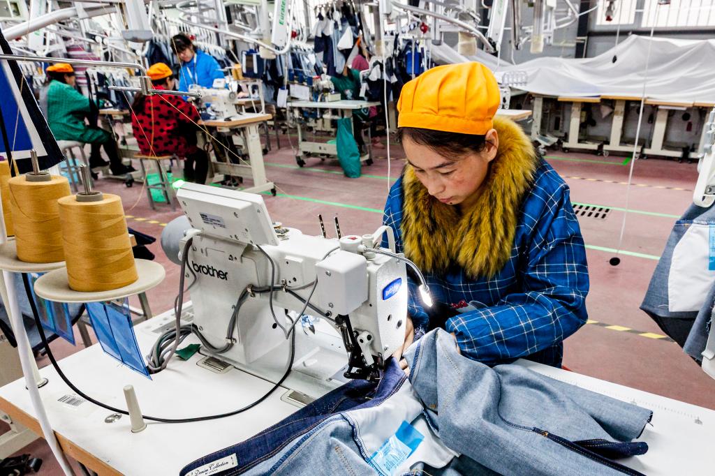 2016年12月12日,河南省滑县慈周寨镇北李庄村,贫困妇女在村口的服装厂打工挣钱。