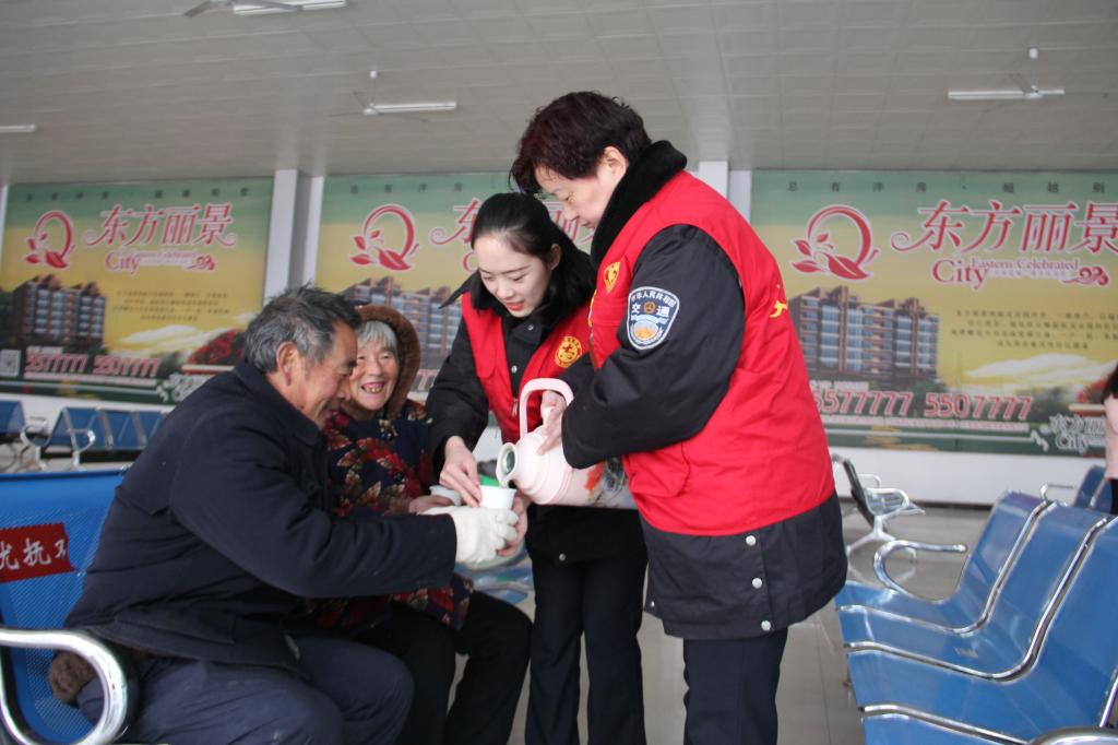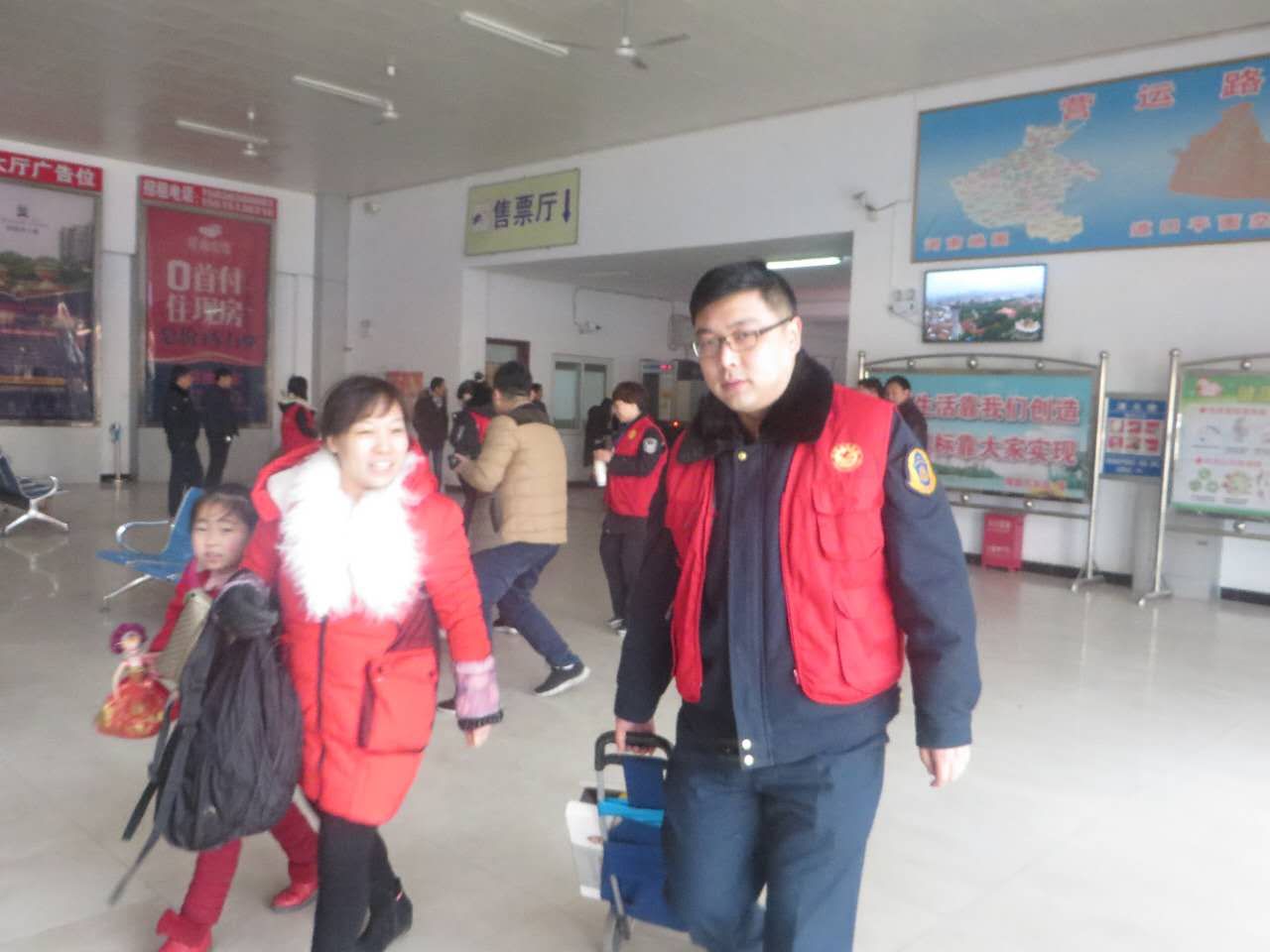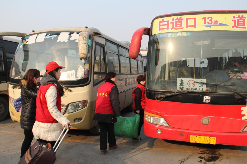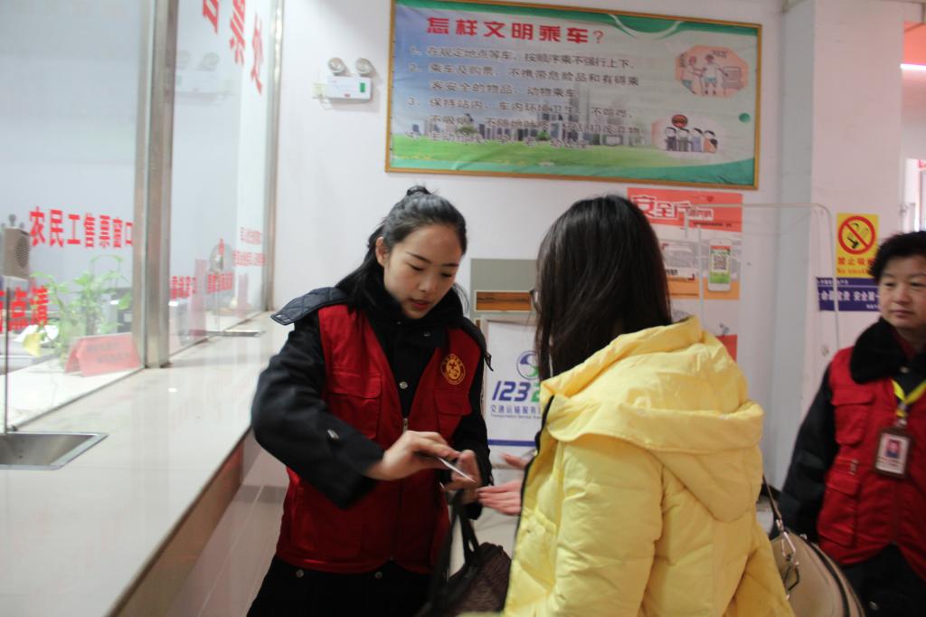 志愿者们分布在售票区、安检口、候车区及乘车区,他们有的积极主动为旅客提供咨询服务,有的引导旅客购票、候车,帮助旅客搬运行李,有的细心照顾老、幼、病、残、孕乘客,还为旅客免费提供了热水、晕车药和其他应急药品,在冬日中为这些奔波在回家途中的旅客送上了一丝温暖、一点关怀和一声祝福。