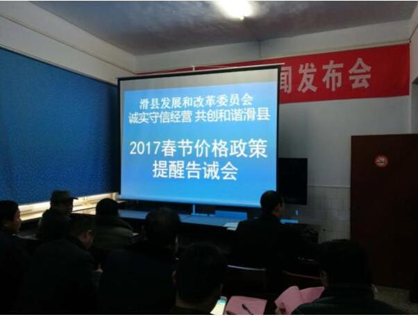 会上,一是传达学习了省发改委《关于转发<国家发展改革委关于加强2017年元旦春节期间市场价格监管的通知>的通知》(豫发改价检〔2016〕1645号)文件;二是组织与会人员摘录学习了《价格法》、《价格违法行为行政处罚规定》、《禁止价格欺诈行为的规定》和《关于商品和服务实行明码标价的规定》等价格法律法规有关条款;三是宣读了《诚实守信经营 共创和谐滑县 春节期间价格政策提醒告诫函》;最后,发改委副主任王义俊对春节期间保持价格稳定的重要意义以及各行业如何加强价格自律、规范经营行为作了具体要求。
