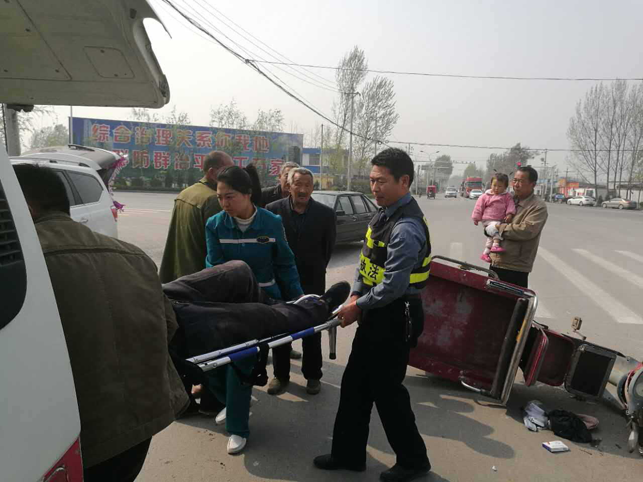 4月12日下午4点,滑县交通运输局治超执法人员罗同钦和同事在河西卡点正常执勤时,突然听到“砰”地一声,寻声望去,发现卫河路与北环路交叉口两辆三轮车相撞,留人在岗值班后,其他执法人员立即赶到现场,看到一位老人满手是血躺在地上痛苦地呻吟着。罗同钦和同事赶紧在事故现场前后设置了警示标志,一边赶紧拨打120急救电话和110报警电话,一边呼喊老人,好在老人意识还算清楚,通过询问,罗同钦联系上老人家人。由于不清楚老人是否伴有骨折和脑部受损等症状,执法人员没敢轻易挪动老人,只是陪伴在老人身边不停安慰着。等待几分钟后救护车到来,罗同钦和同事帮医护人员将老人抬上救护车,并维护现场直到事故处理完毕,大家才放心地离开重新投入治超工作一线。
