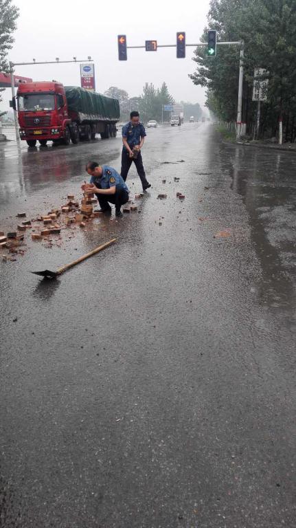 5月3日下午,滑县交通运输局的执法人员在S101省道郑吴线开展日常巡查时,发现禹村附近路面上散落着大量混凝土砖块,给过往车辆行人带来了严重的安全隐患。见此情形,该局执法人员随即下车,放置了危险警示牌,一边冒雨指挥过往车辆行人缓慢通过,一边快速清理路面砖块,经过半小时的努力,路面上的混凝土砖块已清理完毕,交通得到了恢复。