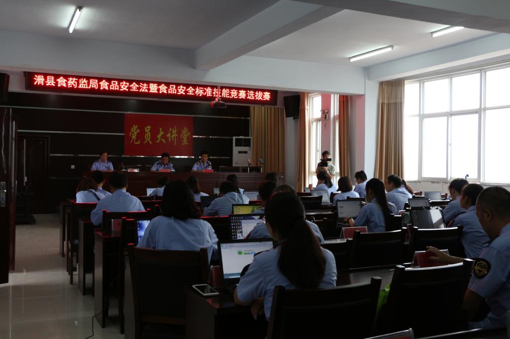 为广泛宣传普及食品安全标准和法律法规知识,进一步提高监管人员的法律素质,根据省局安排,7月28日,滑县食品药品监督管理局在局四楼会议室举办了食品安全法暨食品安全标准知识技能竞赛选拔赛,全局30余名业务骨干参加了此次比赛。