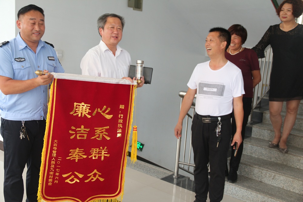 7月3日下午,滑县城市管理综合执法局收到了一份特别的礼物,流动摊位经营户委托城关镇大云寺广场管理人员以及村委会代表送来了一面题为“心系群众,廉洁奉公”的锦旗,感谢城管部门对他们的支持与帮助。