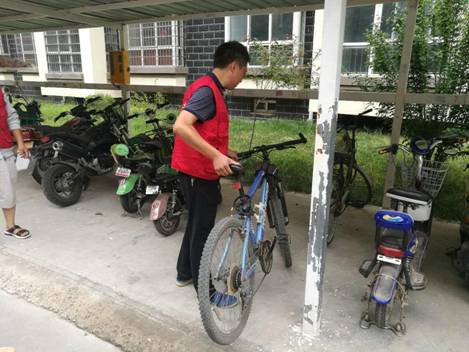 活动现场,志愿者们手持垃圾夹和垃圾袋,捡拾道路上的烟头、绿化带中白色垃圾、清楚墙面上的小广告,并将摆放混乱的自行车和电动车整齐摆放。