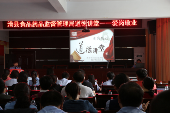 8月31日下午,县食药监局举办了以“爱岗敬业”为主题的道德讲堂活动。滑县文明办副主任、11个县直单位有关同志、食药监局机关全体人员共80余人参加了此次活动。