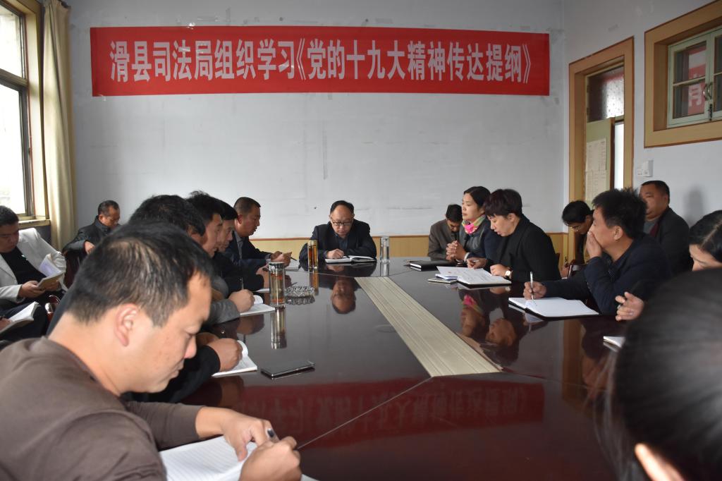 为深入学习贯彻党的十九大精神,10月31日下午,县司法局组织机关全体干警在局三楼会议室认真学习了《党的十九大精神传达提纲》。