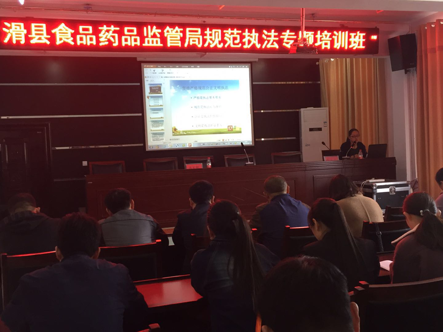 为进一步提升行政执法人员的业务能力、规范行政执法行为,滑县食药监局于11月3日举办了规范行政执法专题培训班,邀请了县法制办副主任宋宜琼进行授课,县局工作人员、各基层所执法人员90余人参加此次培训。