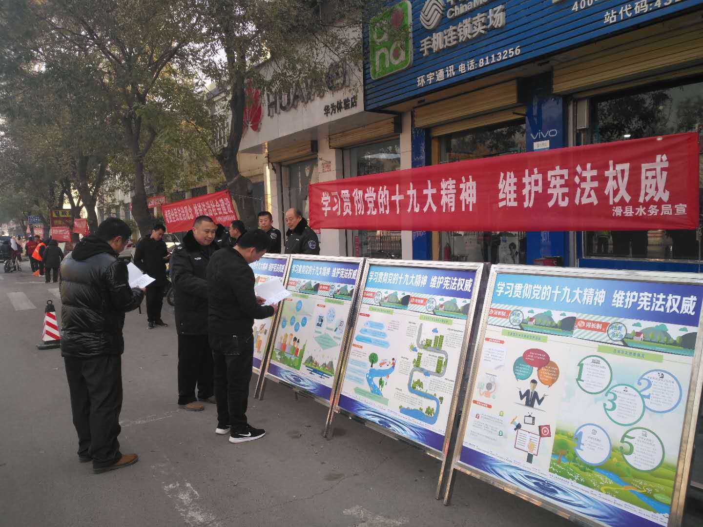 为深入学习贯彻党的十九大精神,增强全民法制观念,推动全社会树立宪法意识,县水务局按照县委、县政府的统一部署,于12月4日参与开展了“学习贯彻党的十九大精神,维护宪法权威”为主题的《宪法》《水法》及相关法律法规的普及宣传活动。