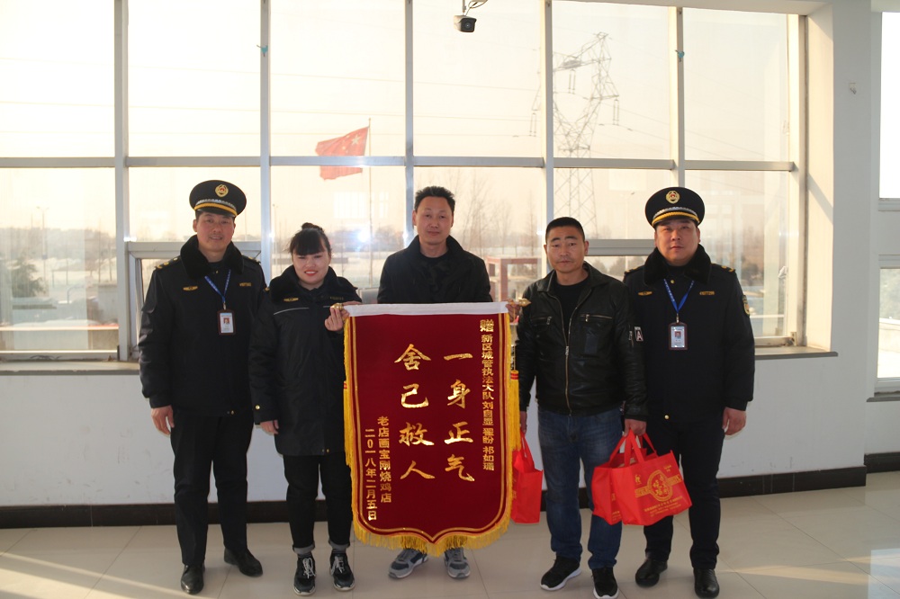 “总算找到你们了,真是太谢谢你们了!如果不是你们的及时救援,我的家人就有生命危险了,真是太感谢了!”2月7日下午,老店镇两位村民专程到县城市管理综合执法局,将一面绣着“一身正气 舍己救人”的锦旗送到了城市管理综合执法局新区执法大队刘自显、翟盼、祁如姗三位执法队员手中,以感谢他们对儿媳等5人的救命之恩。