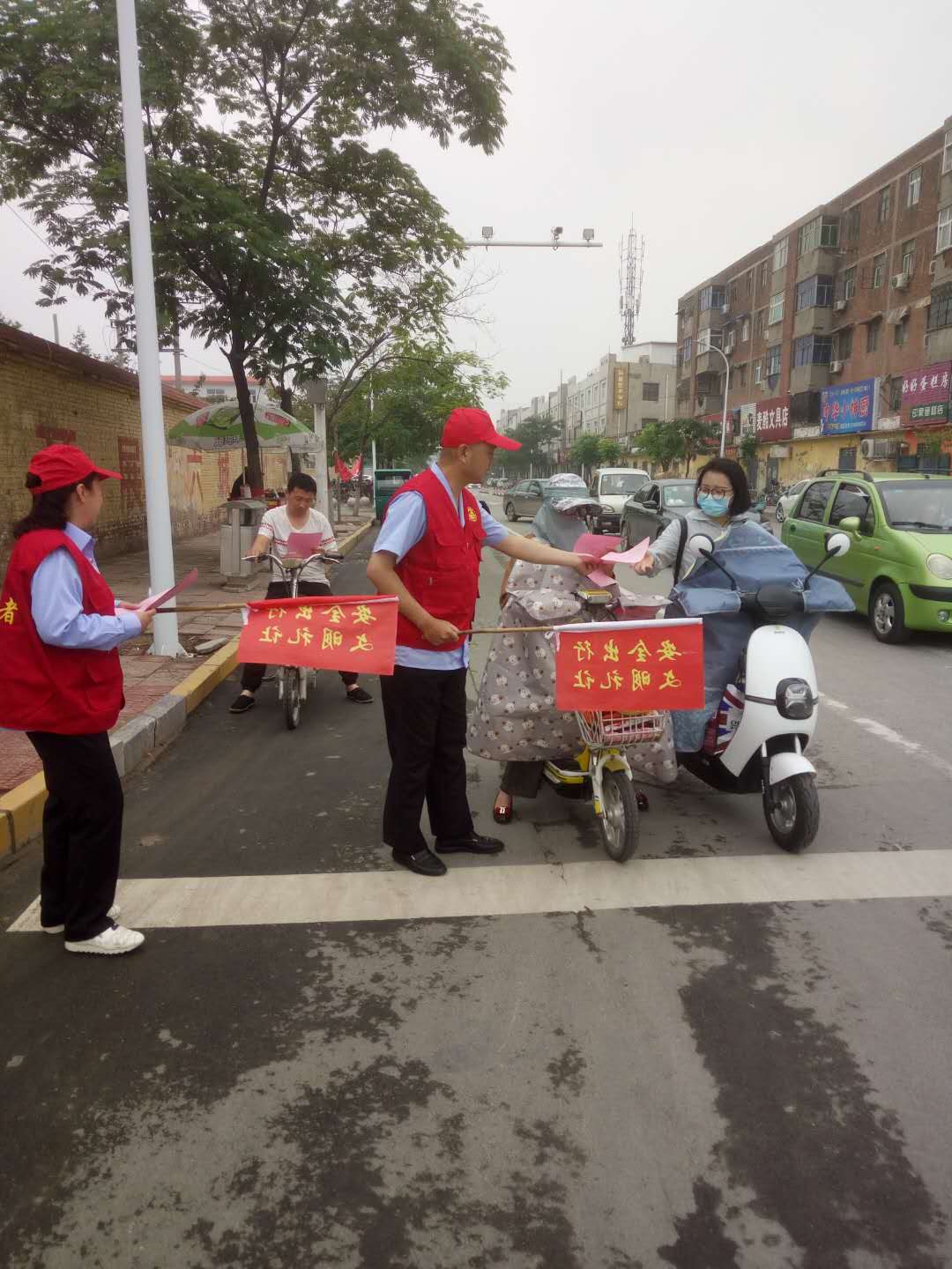在活动现场,文明志愿者身穿红色马甲,手举劝导旗,劝导行人及非机动车不闯红灯、不乱穿马路,劝导机动车礼让斑马线,提倡文明出行,营造良好的交通秩序。志愿者们文明执勤,热情服务,赢得了过往群众的大力称赞。