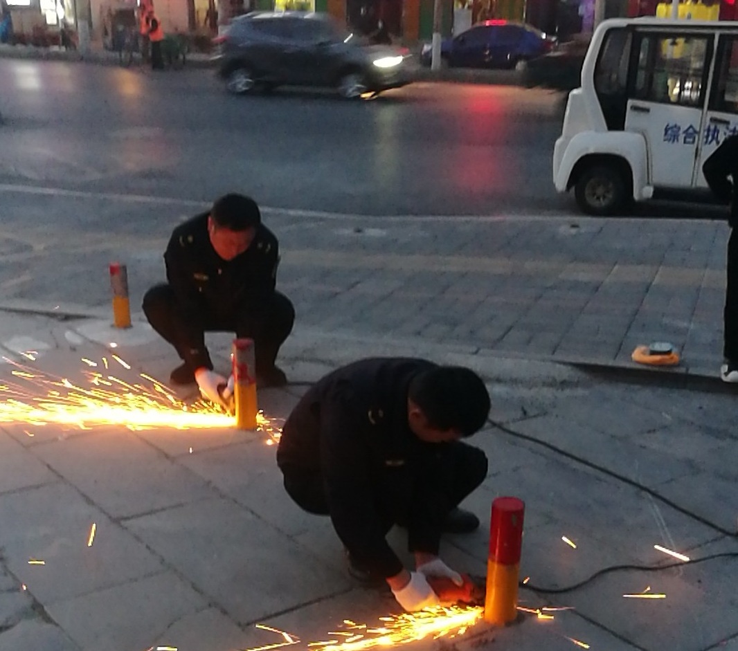近日,针对县城区道路违规私设地桩、地锁等障碍物,严重影响道路通行和市容市貌的问题,滑县城管局先后出动30余名执法人员,聘请专业工人利用氧焊、撬杠、铁锤、扳手等专业工具,清除了中心城区红旗路路、解放路、卫河路等路段以及重点部位违规私设的160余个地桩、地锁等障碍物,恢复了道路及公共空间。