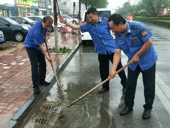 雨情就是命令,坚守就是使命。县城管局各执法大队全体干部职工立即投入城区防汛工作,按照县城管局城区防汛工作预案以及防汛安排的相关工作要求,冒雨纷赴各自责任路段,疏通下水口、清理杂物,加速雨水外排,针对主城区易积水路段,加派防汛人员,在做好防汛工作的同时,加大巡查频次,细致排查倾斜、倒塌行道树木、危损广告门头等安全隐患,做好防范工作,全力应对汛情。