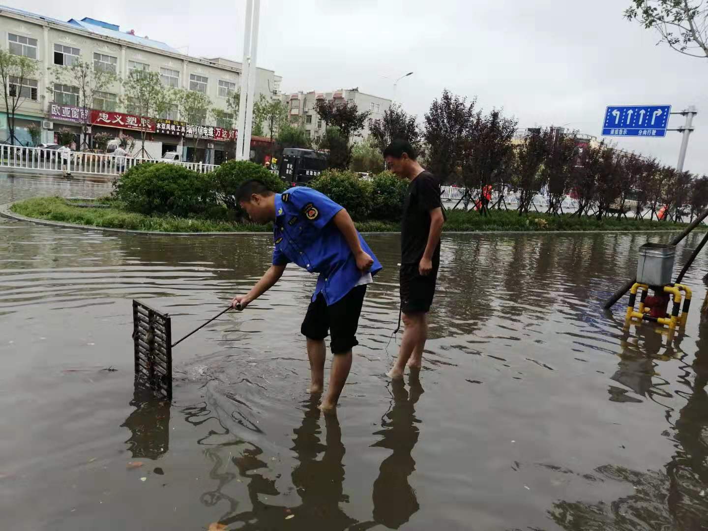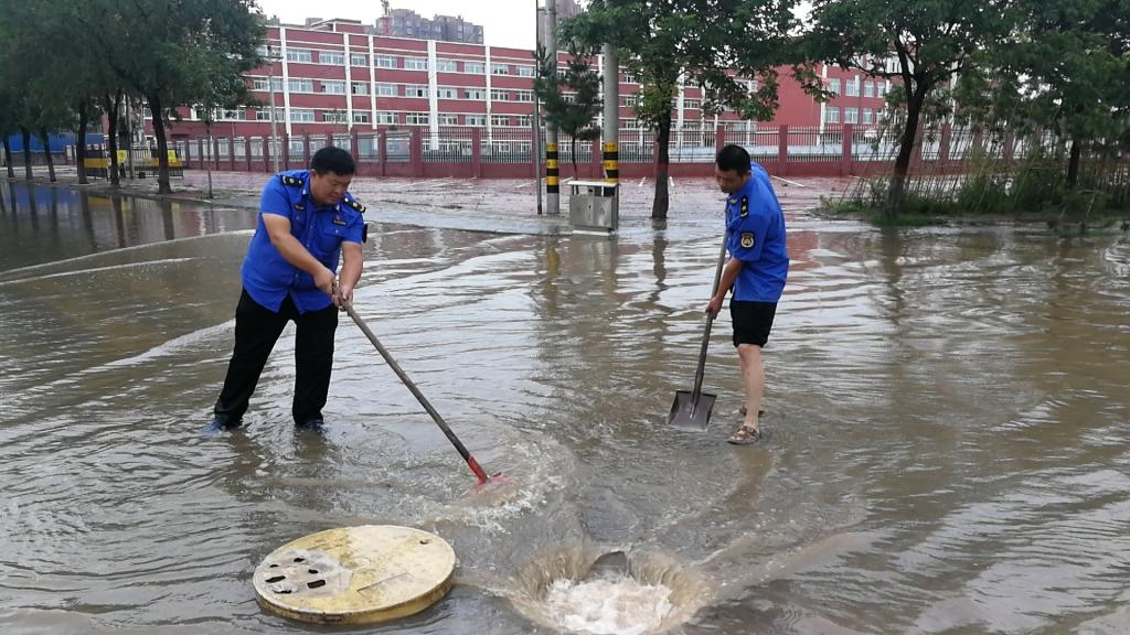 在城区文明路、人民路、解放路、滑台路、滑兴路、卫河路、贸易路等城区容易发生水浸的区域,城管防汛抢险队员光脚来回穿梭在大雨中,一遍遍趟入污水里,打开井盖、雨篦子,用铁锹、铁钩、手抓等方式疏通下水口、清理杂物,加速雨水外排,并竖立警示标识,提醒过往车辆、行人注意安全;雨势小后,又快速调集环卫工人、高压冲洗车辆清理主次干道上的泥沙和积水,经过近三个小时的战斗,目前路面积水已得到疏通,及时消除了暴雨带来的安全隐患,用实际行动保障市民人身财产安全。在做好防汛工作的同时,加大巡查频次,细致排查倾斜、倒塌行道树木、危损广告门头等安全隐患,扎实做好防范工作。