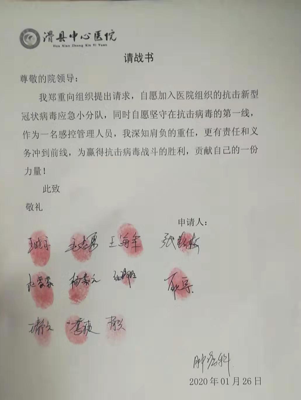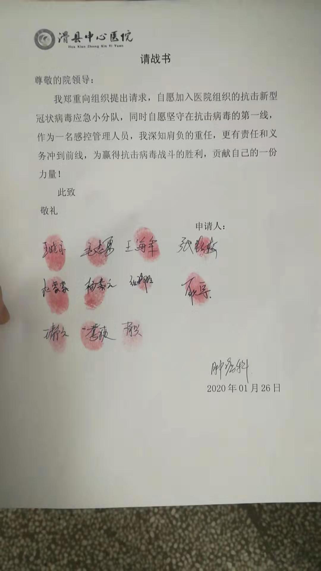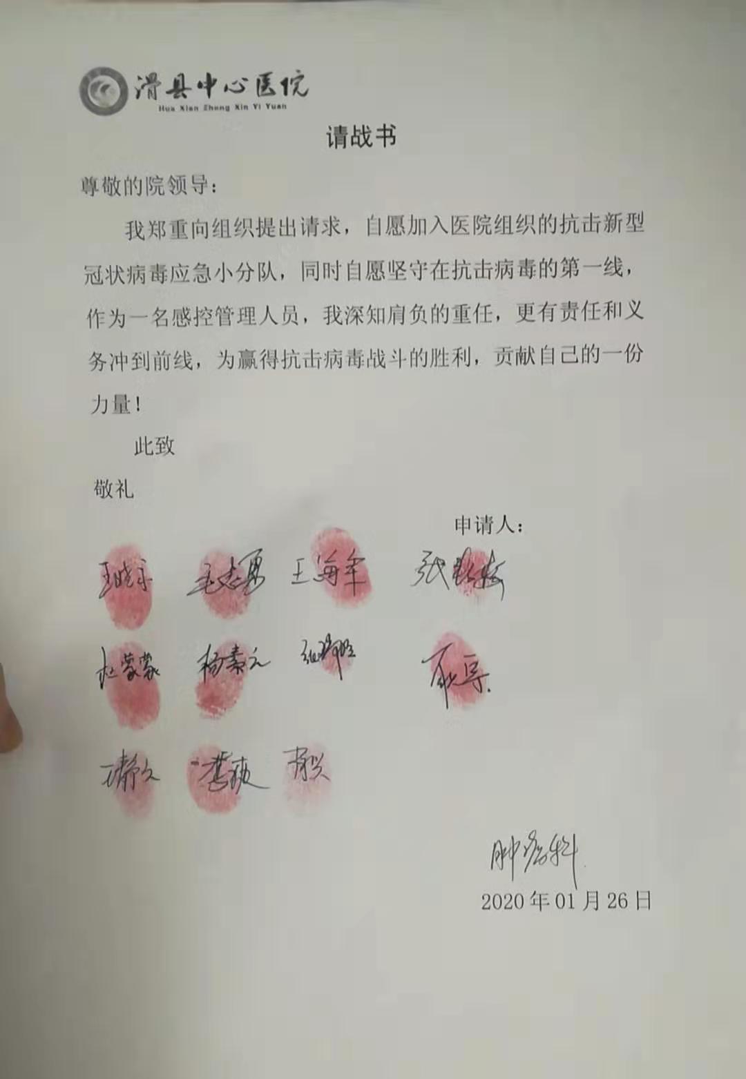 1月26日,县中心医院全体医护人员坚守岗位,不惧风险,纷纷自发写下请战书,要求参加更艰巨的任务,一份份按有鲜红手印的请战书,印证了她们的决心和信心!