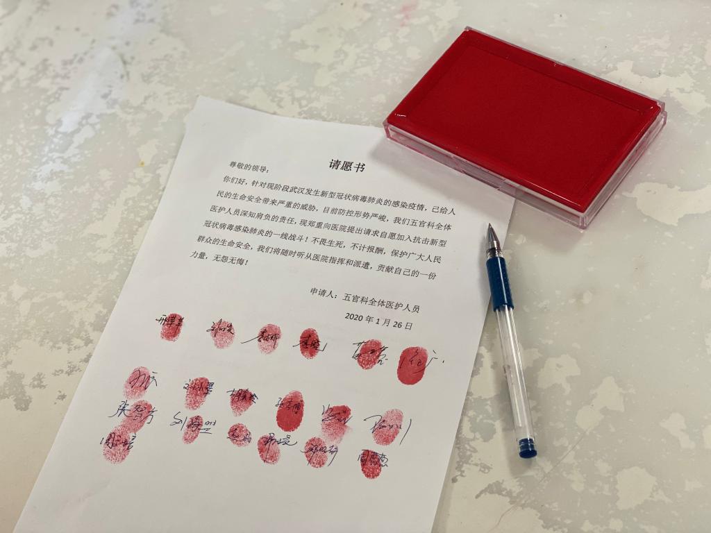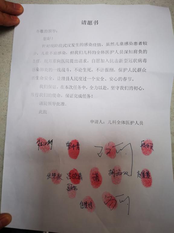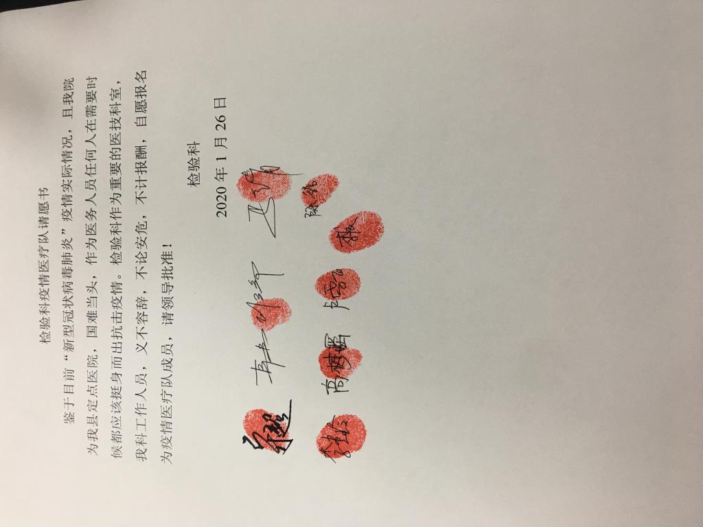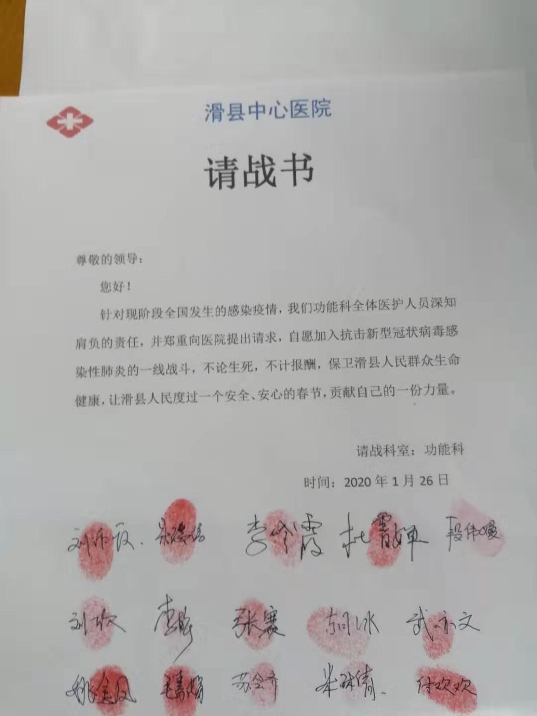 1月26日,县中心医院全体医护人员坚守岗位,不惧风险,纷纷自发写下请战书,要求参加更艰巨的任务,一份份按有鲜红手印的请战书,印证了她们的决心和信心!