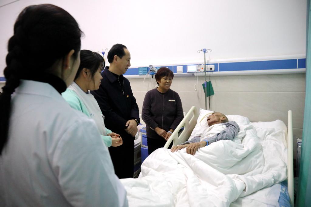 在医院病房,院长席连峰和工会主席张会遵都关切询问了住院职工家属的病情,叮嘱他们注意休息,安心养病,祝愿早日康复。