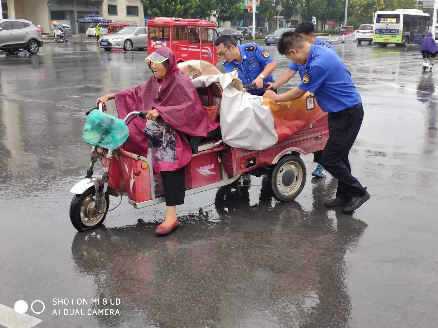 三轮车雨中爆胎,滑县城管及时伸出援手