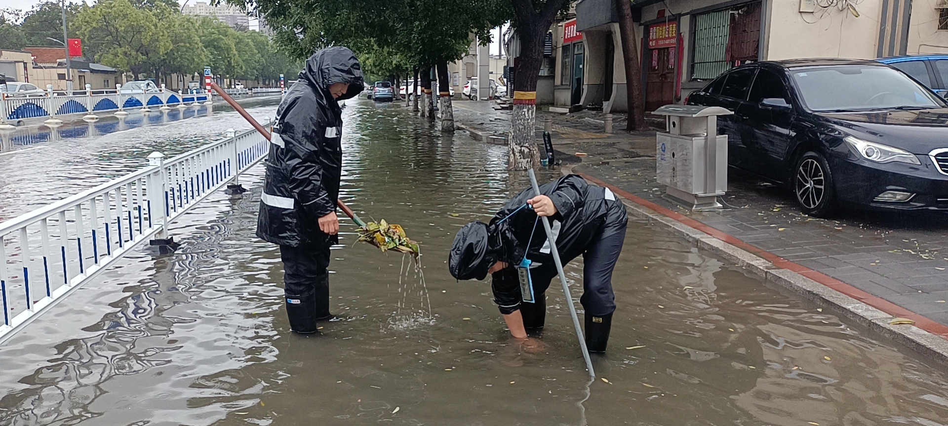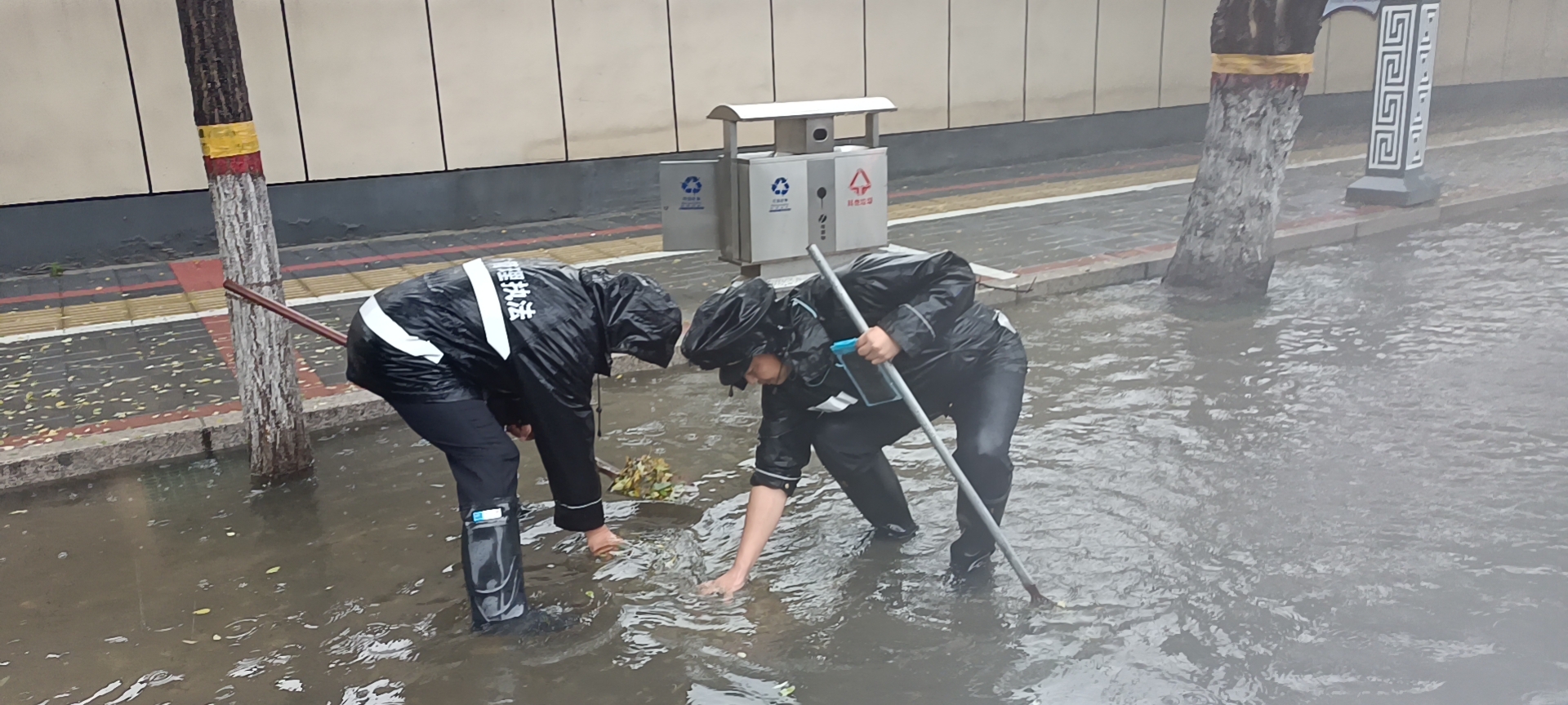 防汛抢险队员及时清理雨水篦、窨井盖周边树叶、树枝、塑料袋等垃圾杂物,帮助快速排水;对积水倒灌冲起窨井盖,立即采取设置临时路障等措施,引导车辆和行人安全通行,及时对受困群众进行救助。