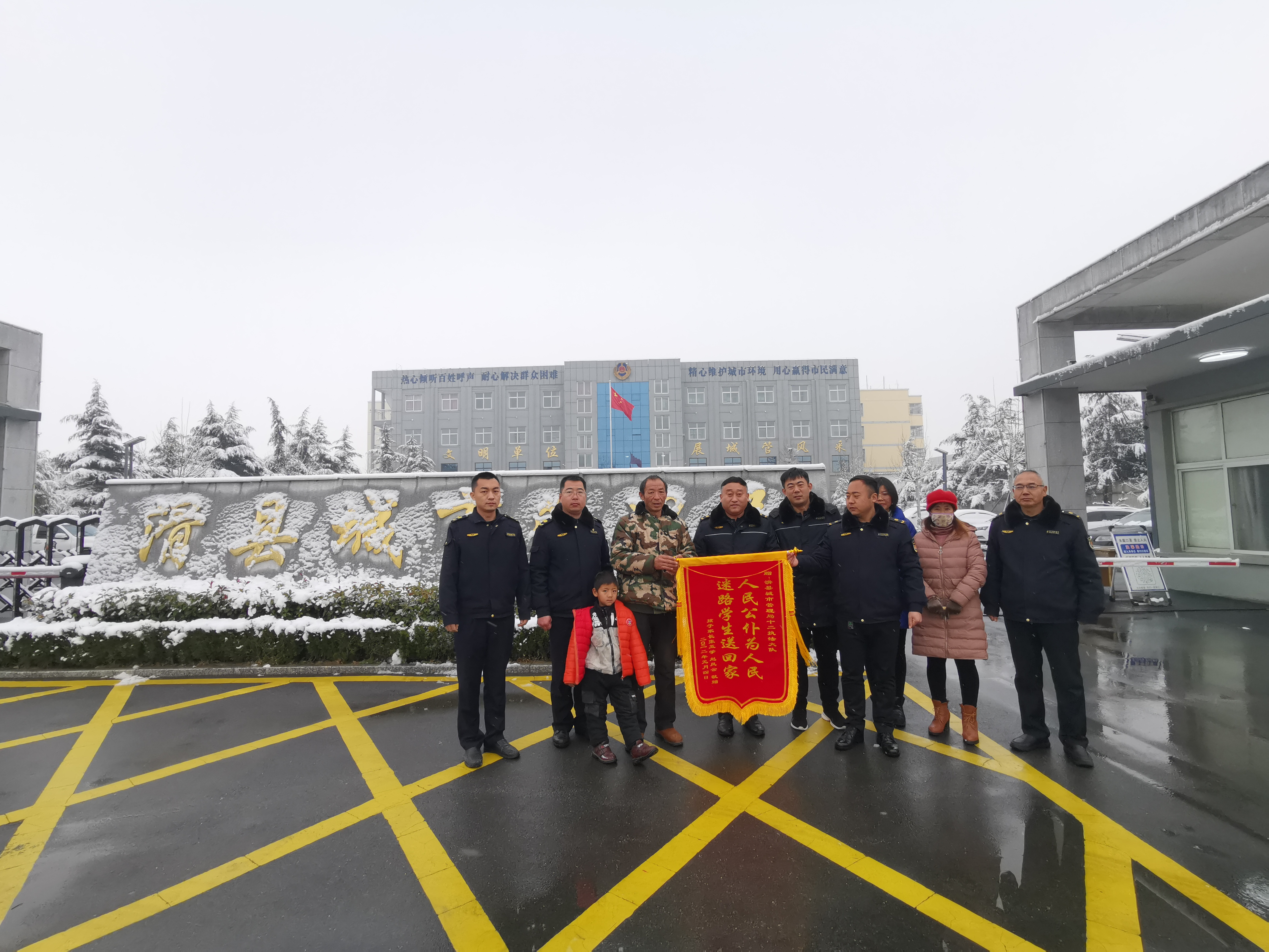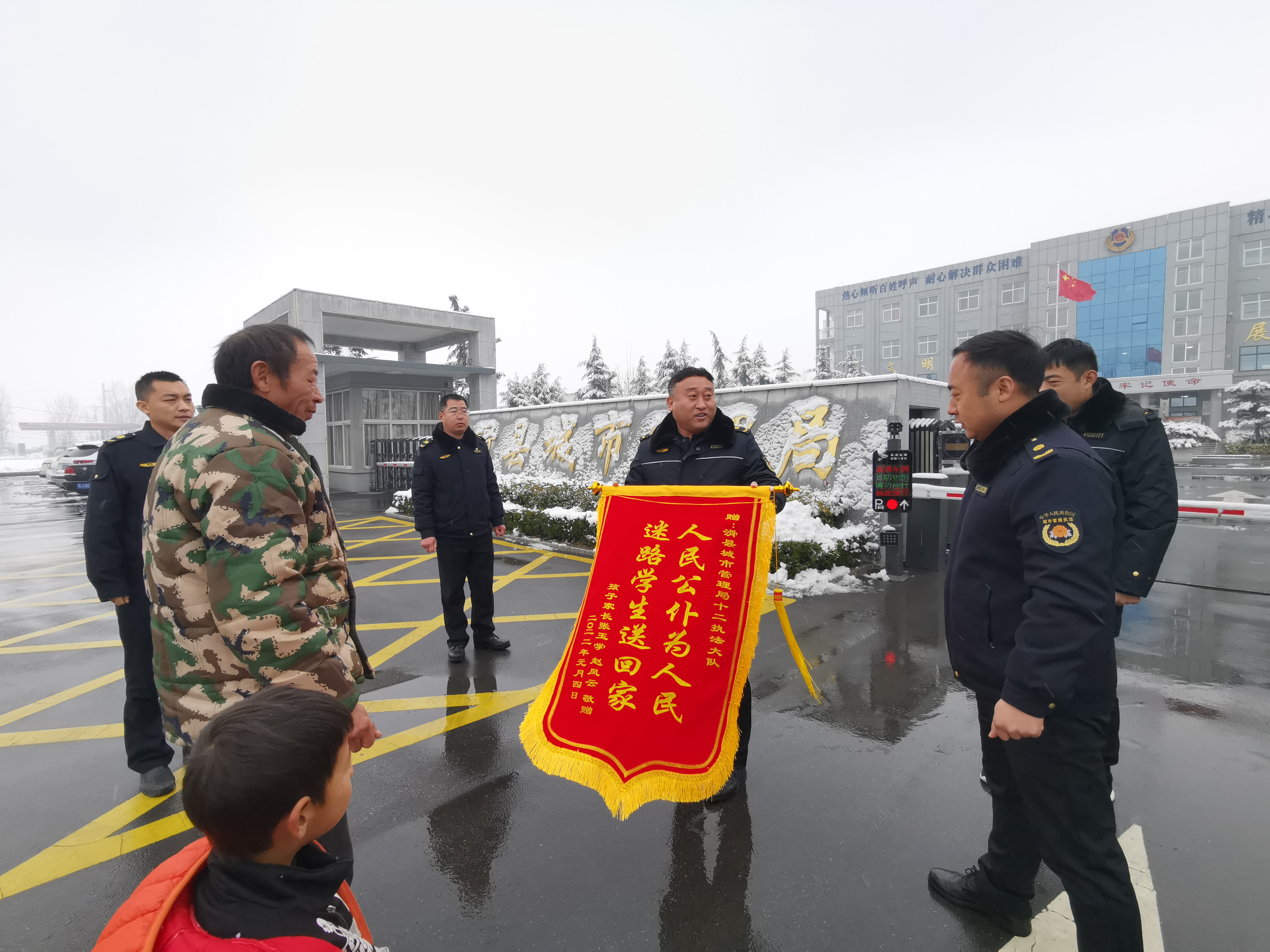 2022年1月5日上午,滑县枣村乡闫楼村村民一行三人手握一面“人民公仆为人民,迷路学生送回家”的锦旗送到滑县城市管理局,感谢城管执法队员在昨日早上将迷路女童安全送到家中。