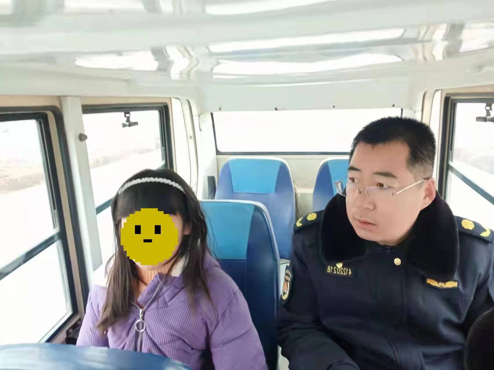 经过执法人员的不懈努力,最终联系上小女孩的家人,考虑到小女孩的爷爷奶奶年事已高再加上天气寒冷路途遥远,同时也为了保证她的人身安全,队长高利伟驾驶执法车将小女孩护送回家。