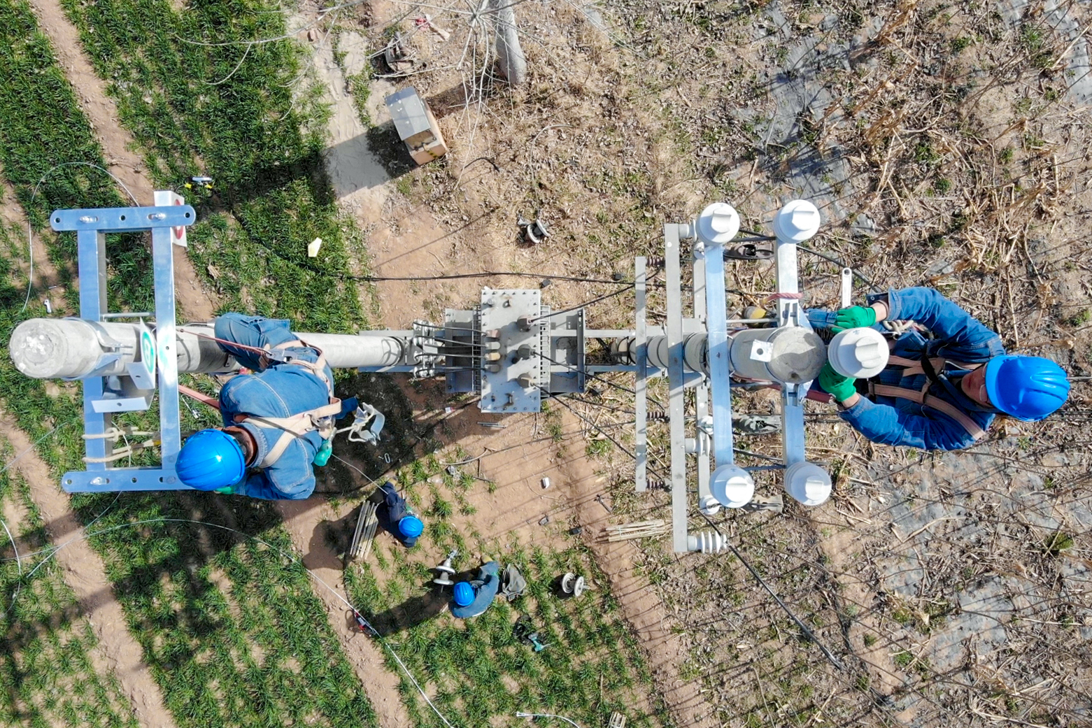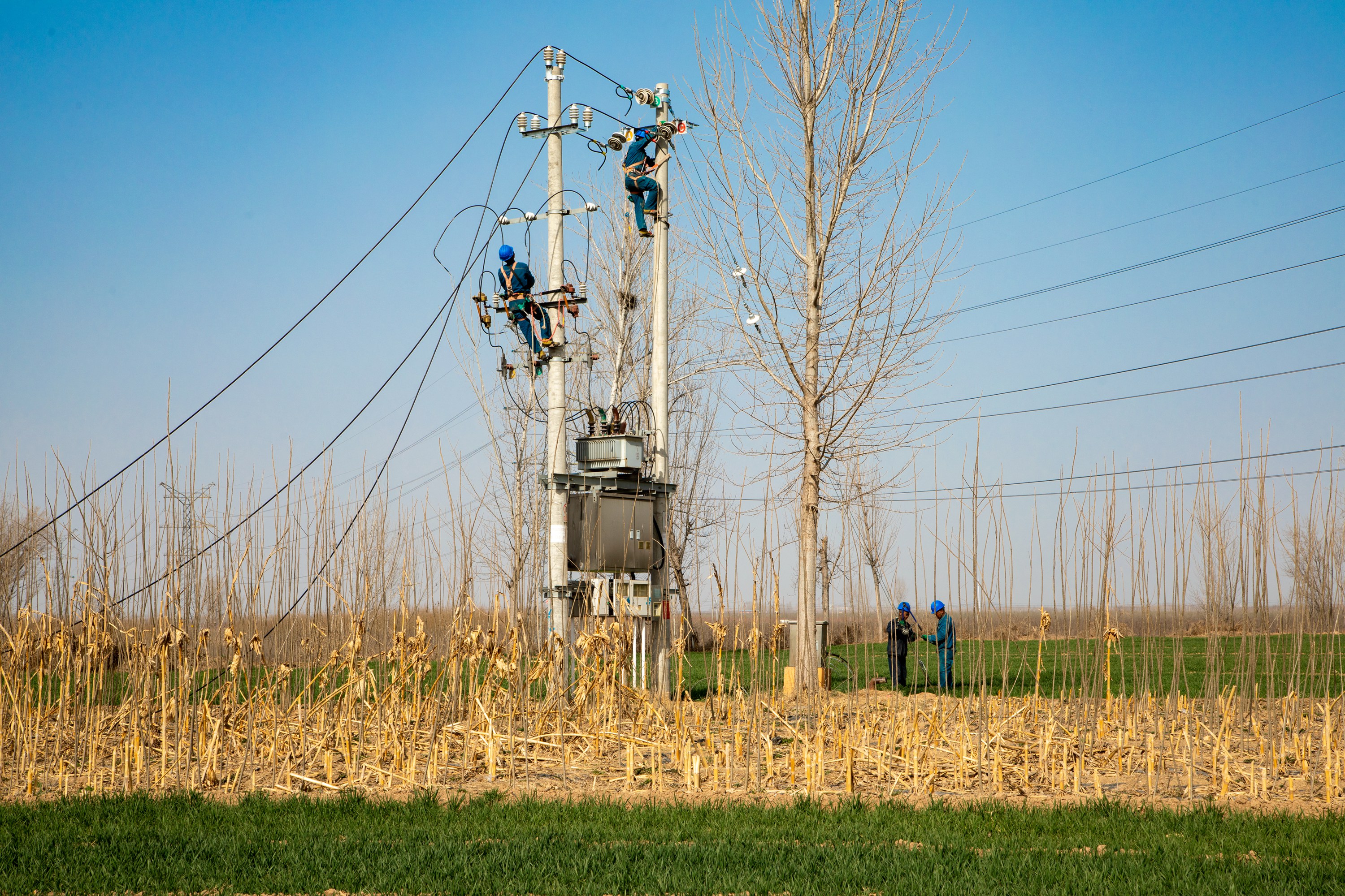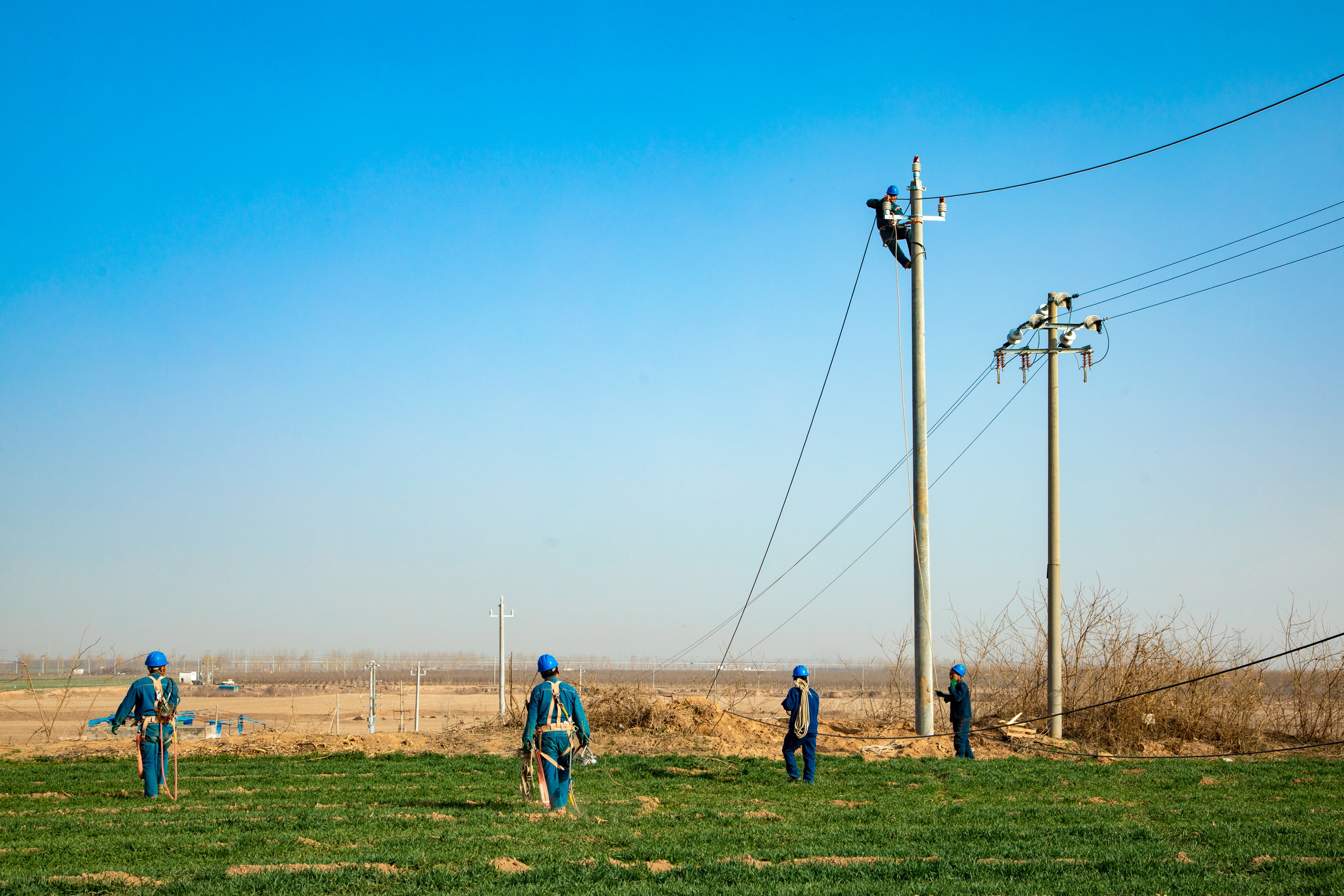 3月9日,春回大地,万物竞长,在河南滑县长虹坡蓄滞洪区一望无际的田地里,青翠麦苗茁壮成长。国网滑县供电公司宋德俭等16名电力工人正在加紧施工,升级改造农排电力设施,确保麦苗喝足“返青水”。