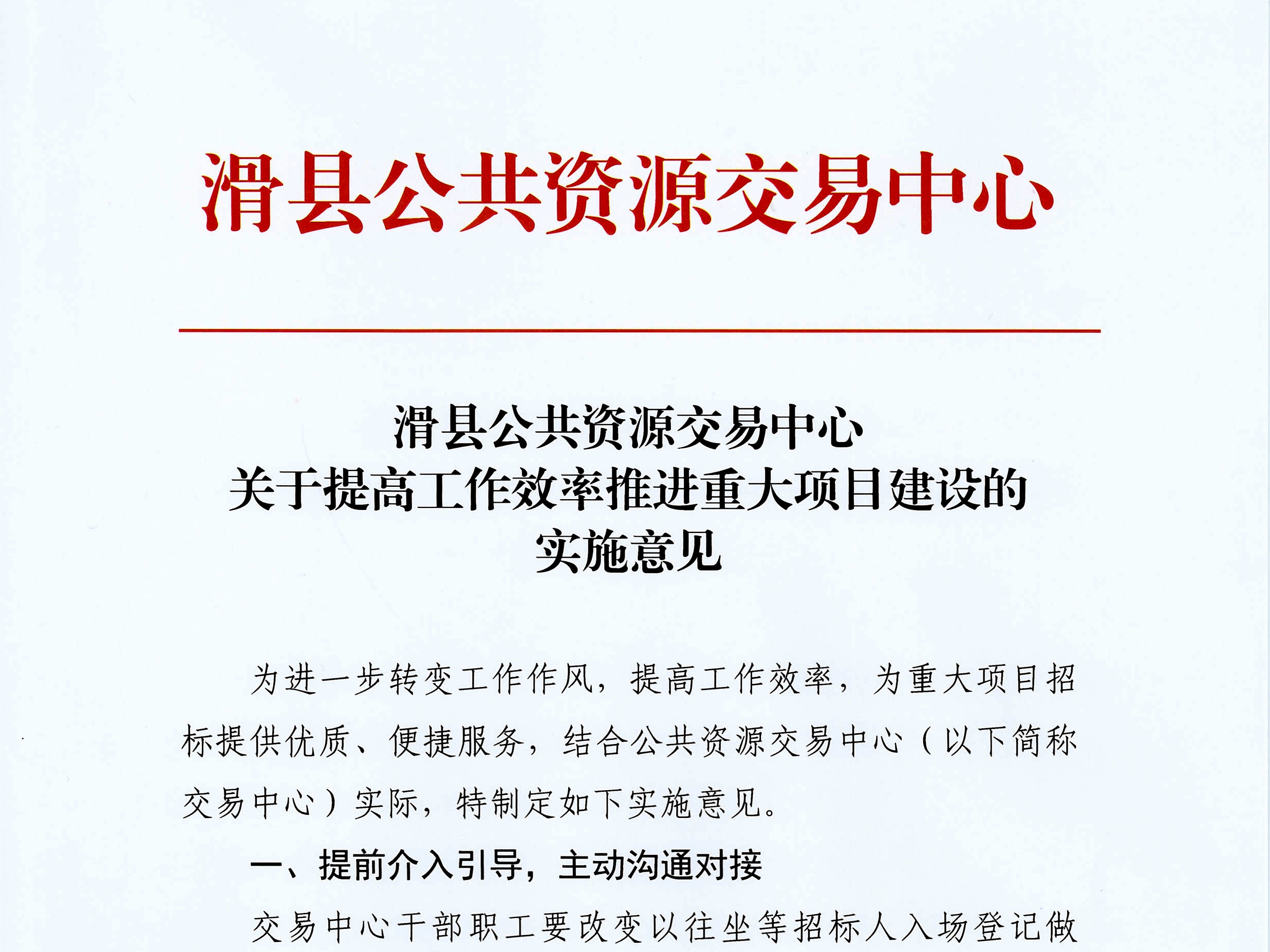 一、简化工作流程,效率提升到位。制定实施了《滑县公共资源交易中心关于提高工作效率推进重大项目建设的实施意见》,进一步简化前置条件,优化办理流程。对时间紧、任务重的重大项目、民生工程,开辟绿色通道,按照“能快则快”、“能简则简”、“能优则优”的原则,确保项目及时、有序开展。