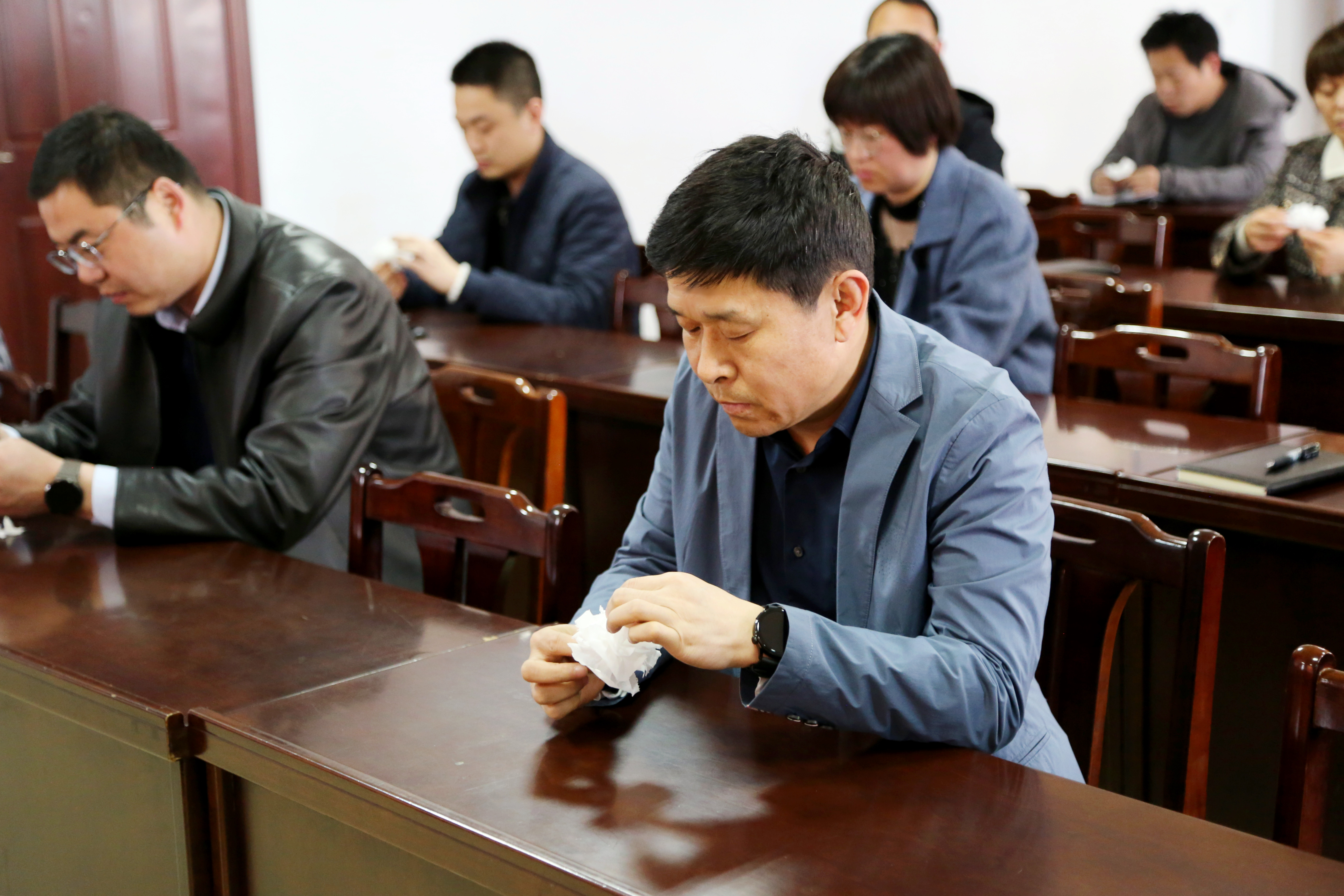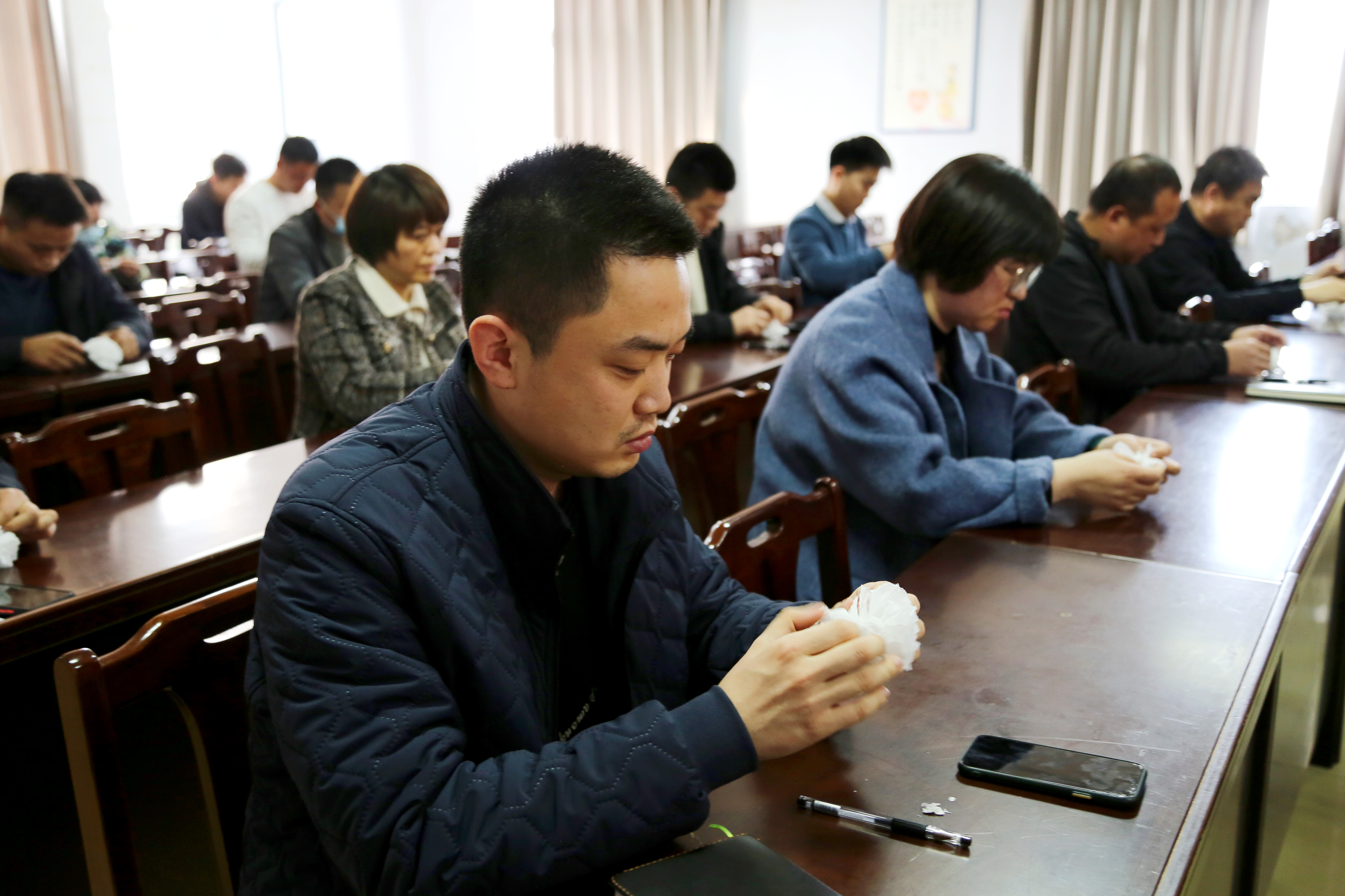 随后,中心干部职工通过反复观看视频制作教程,充分发挥创造能力和动手能力,裁纸、折纸、捆扎,认真用手中的材料去制作自己心中的“花”,亲手将对先烈的缅怀之情和崇敬之意折进了每一朵圣洁的白花里。