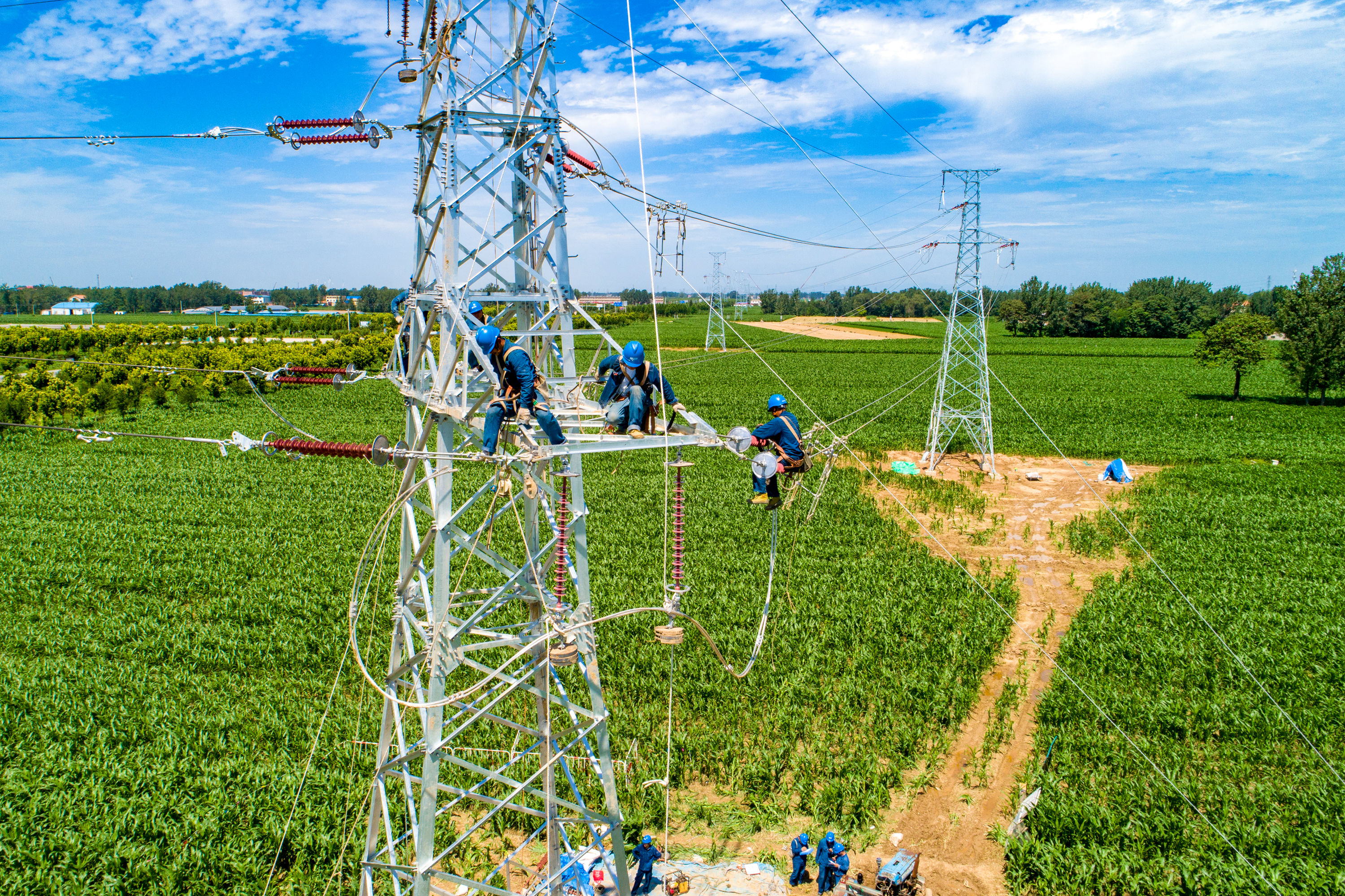 2022年7月21日12时,烈日炎炎,潮湿闷热,在河南滑县老店镇东悦庄村田地里,徐卫东、高鹏等30多名电力工人正在20多米高的110千伏楚老输电线路35号杆塔顶施工作业,为该线路投运做最后准备。