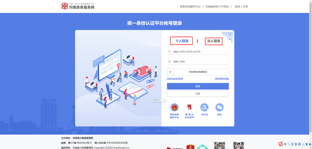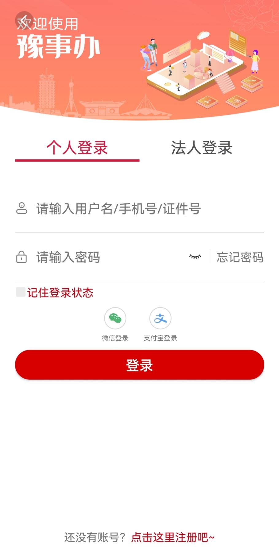 二、点击右上角登录账号,可使用账号、手机号、证件号、豫事办、支付宝、微信等方式登录。个人办事请选择个人账号登录,法人办事请选择法人账号登录。若未注册账号请先点击“注册”注册账号。