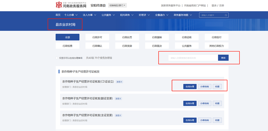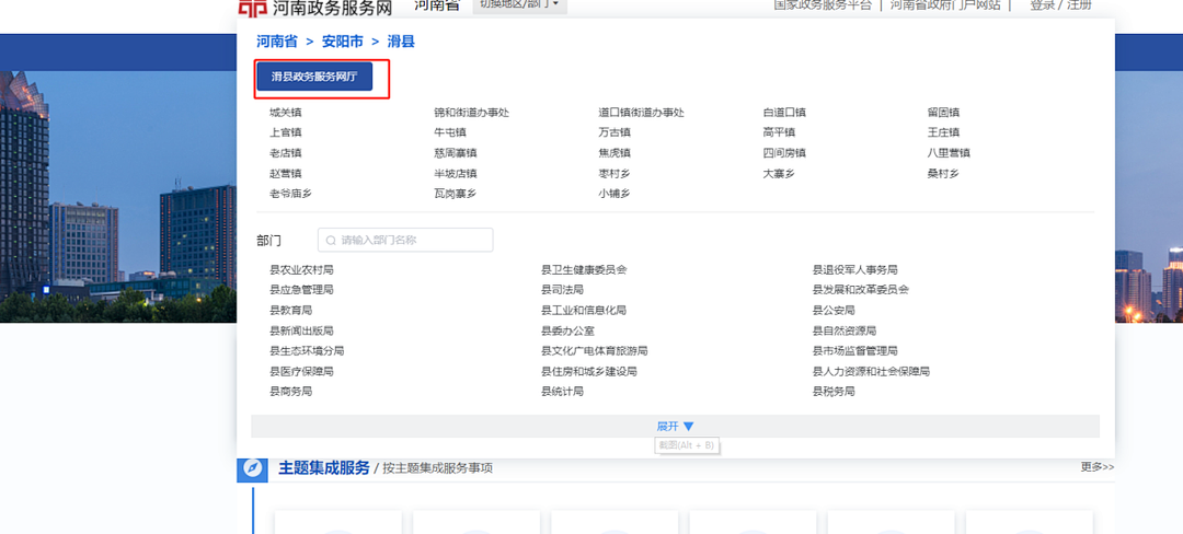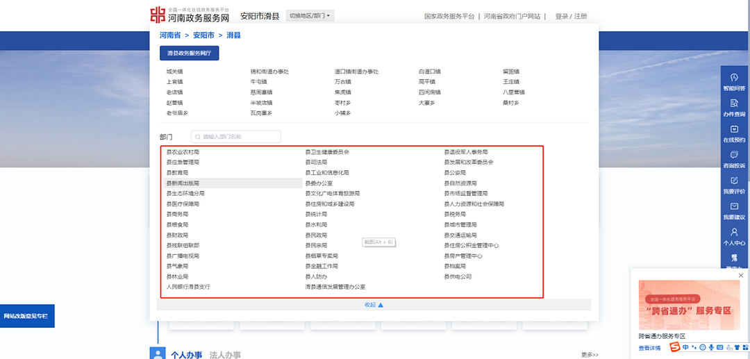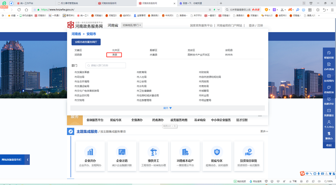 三、登录后点击上方切换部门/地区,选择安阳市→滑县→滑县政务服务网厅,选择要办理的事项所属部门进入。