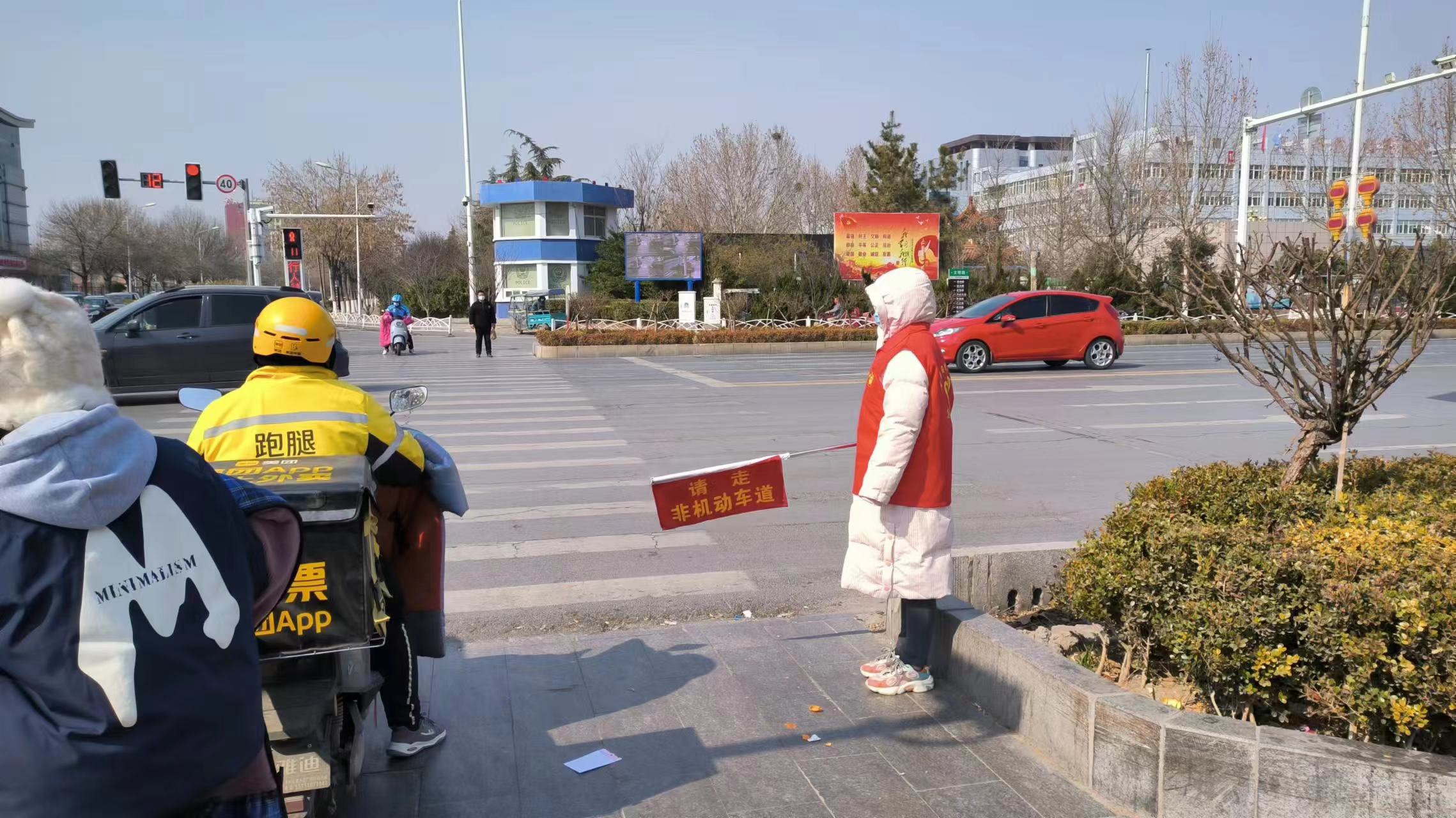“您好,请不要越线!”“您好,请勿逆行。”上午7:30,志愿者们就已经到达路口红绿灯处开始执勤工作。他们身穿红马甲,通过手势指引、语言劝导等方式,认真引导行人及车辆,并及时对不文明交通行为进行劝阻;引导过往行人、自行车、电动车等遵守交通规则有序通行,重点对骑乘电动自行车逆向行驶、不在非机动车道内行驶、行人横穿道路未走人行横道等交通违法行为进行劝导,引导小朋友不追逐打闹,文明过马路,给行动不便的老人提供热情的帮助,为他们排忧解难。教育群众摒弃交通陋习,遵守法规出行,自觉抵制各类交通违法行为,并倡导广大群众“做文明人、走文明路”,争做文明交通参与者。