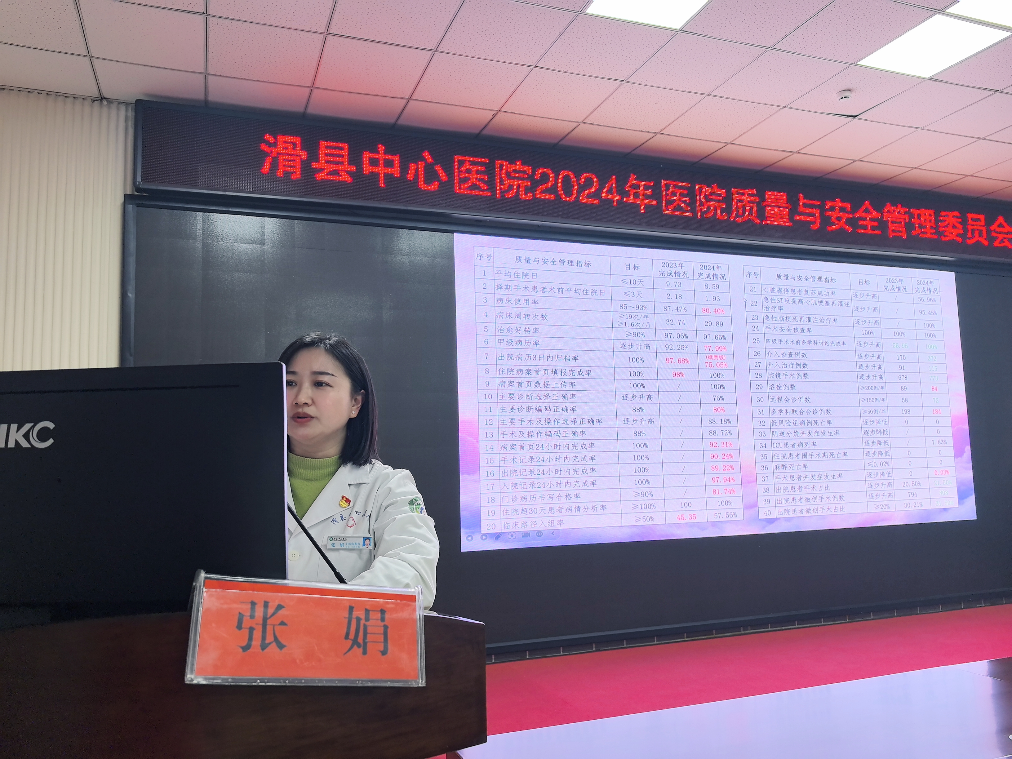 会议围绕以下四项议程逐步推进。首先,质控办副主任张娟代表医院质量与安全管理委员会,对2024年的工作进行了全面汇报,并提出了2025年的工作规划。张娟副主任详细阐述了过去一年里医院在质量与安全管理方面所取得的成绩和面临的挑战,为后续的讨论提供了坚实的基础。