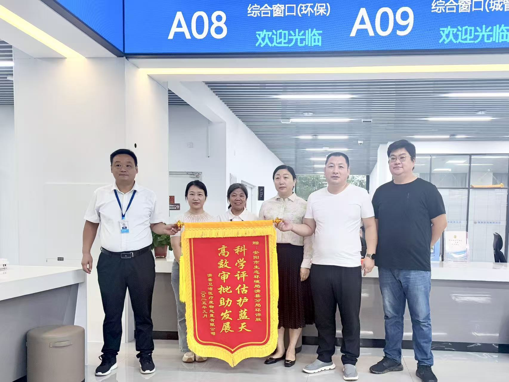 近日,滑县卫洁医疗废物处置有限公司负责人特将一面印有“高效审批助发展 科学评估护蓝天”的锦旗送到安阳市生态环境局滑县分局工作人员手中,以此表达对滑县分局在环评手续办理过程中提供优质服务的衷心感谢。