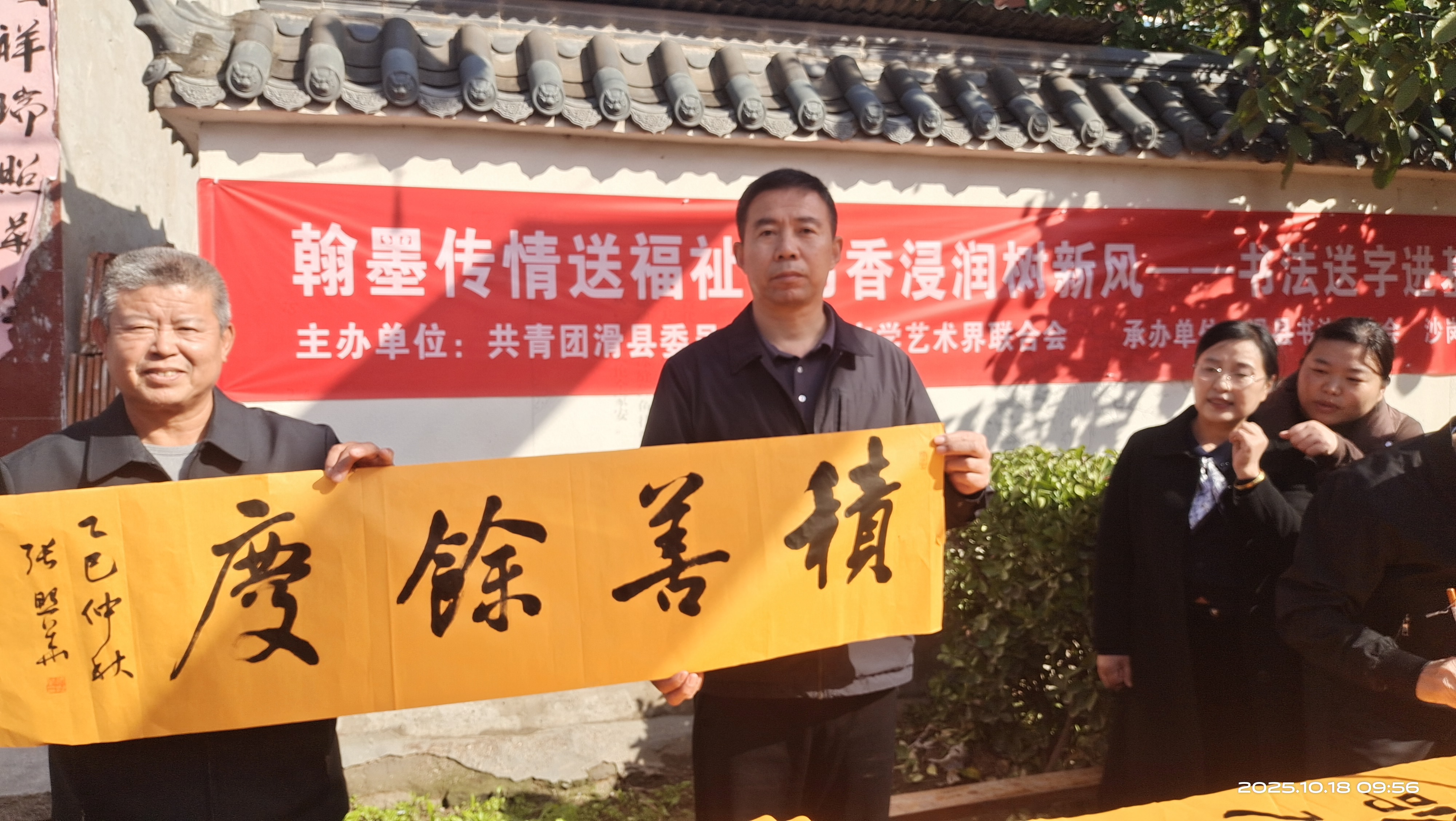 为弘扬中华优秀传统文化,丰富基层群众精神文化生活,助力乡村文化振兴,近日共青团滑县委员会联合滑县文学艺术界联合会、滑县书法家协会,走进留固镇沙岗村,举办了一场“翰墨传情送福祉,书香浸润树新风”书法送字进基层活动。此次活动恰逢沙岗村纪念孔子诞辰2576年庆典,不仅为传统节日增添了浓郁的文化氛围,更是基层团干部积极组织参与派驻村活动、服务基层群众的有力体现。