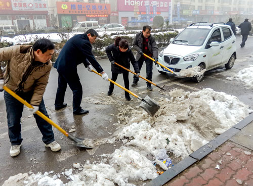 12月1日,河南省滑县党政机关的党员干部走上街头,铲除地面的冰雪,方便群众出行。(王子瑞 摄)