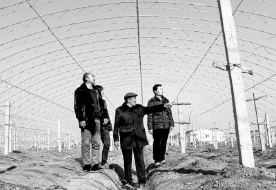 王洪梅(右二)在葡萄园种植基地查看大棚搭建情况 本报记者邓放摄