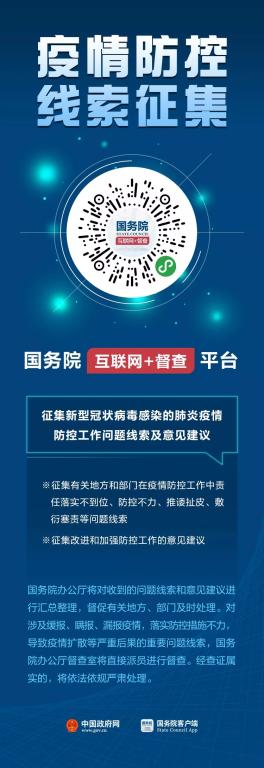 为贯彻落实党中央、国务院重要决策部署,切实做好新型冠状病毒感染的肺炎疫情防控工作,按照有关工作要求,国务院办公厅从即日起在国务院“互联网+督查”平台面向社会征集有关地方和部门在疫情防控工作中责任落实不到位、防控不力、推诿扯皮、敷衍塞责等问题线索,以及改进和加强防控工作的意见建议。国务院办公厅将对收到的问题线索和意见建议进行汇总整理,督促有关地方、部门及时处理。对涉及缓报、瞒报、漏报疫情,落实防控措施不力,导致疫情扩散等严重后果的重要问题线索,国务院办公厅督查室将直接派员进行督查。经查证属实的,将依法依规严肃处理。