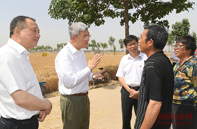 6月4日上午,省长尹弘到安阳市滑县调研“三夏”工作。高标准农田里麦浪翻滚、机声隆隆,尹弘走进田间地头同种粮大户们亲切交谈,详细了解当地麦粒品相、收成、农机补贴等情况。他说,咱们河南的小麦闻名全国,今年情况不一般,疫情面前大家都在关心农业收成怎样。今年我们有了大丰收,既能让当地老百姓增收致富,更是给党中央国务院交出了满意答卷。他还叮嘱,县乡各级要从各个方面服务好农民群众,充分调动大家种粮积极性,真正确保丰收丰产。(文/李鹏 图/杜小伟)