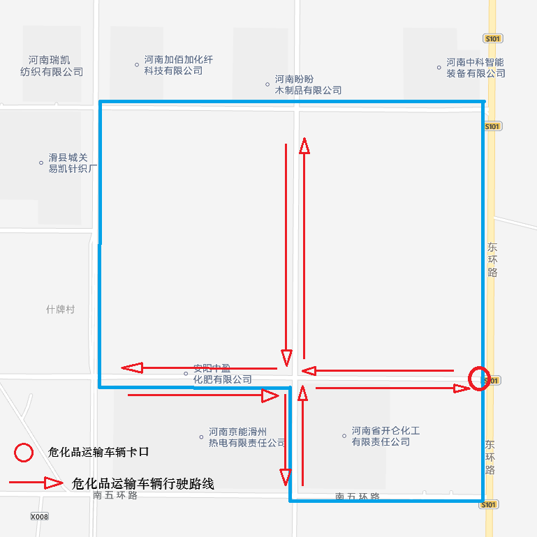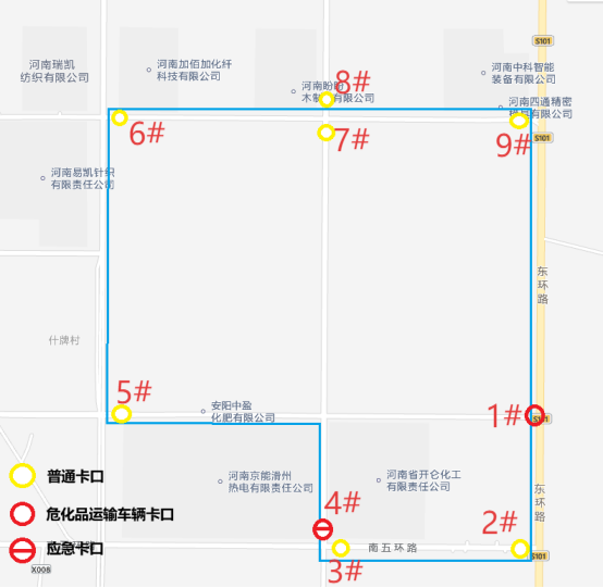 滑县煤化工产业园封闭化管理共设9个卡口,分别是漓江路东至东环路为1#闸口、珠江路东至东环路为2#闸口、珠江路与锦华路交叉口的东侧和北侧分别为3#、4#闸口、漓江路西至创业大道为5#闸口、黄河路西至创业大道为6#闸口、黄河路与锦华路交叉口南、北侧分别为7#、8#闸口、黄河路东至东环路为9#闸口。其中1#闸口为危化品运输车辆闸口,供危险化学品运输车辆通行,4#闸口为应急通道平时保持关闭,其余为普通卡口。