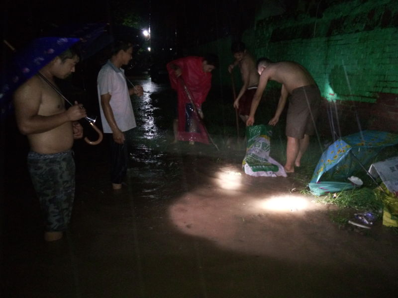 在镇党委政府号召带领下,大雨中各村越来越多的党员干部、群众,都穿着雨衣手拿铁锹、肩扛沙袋纷纷投入到防汛救灾工作中。
